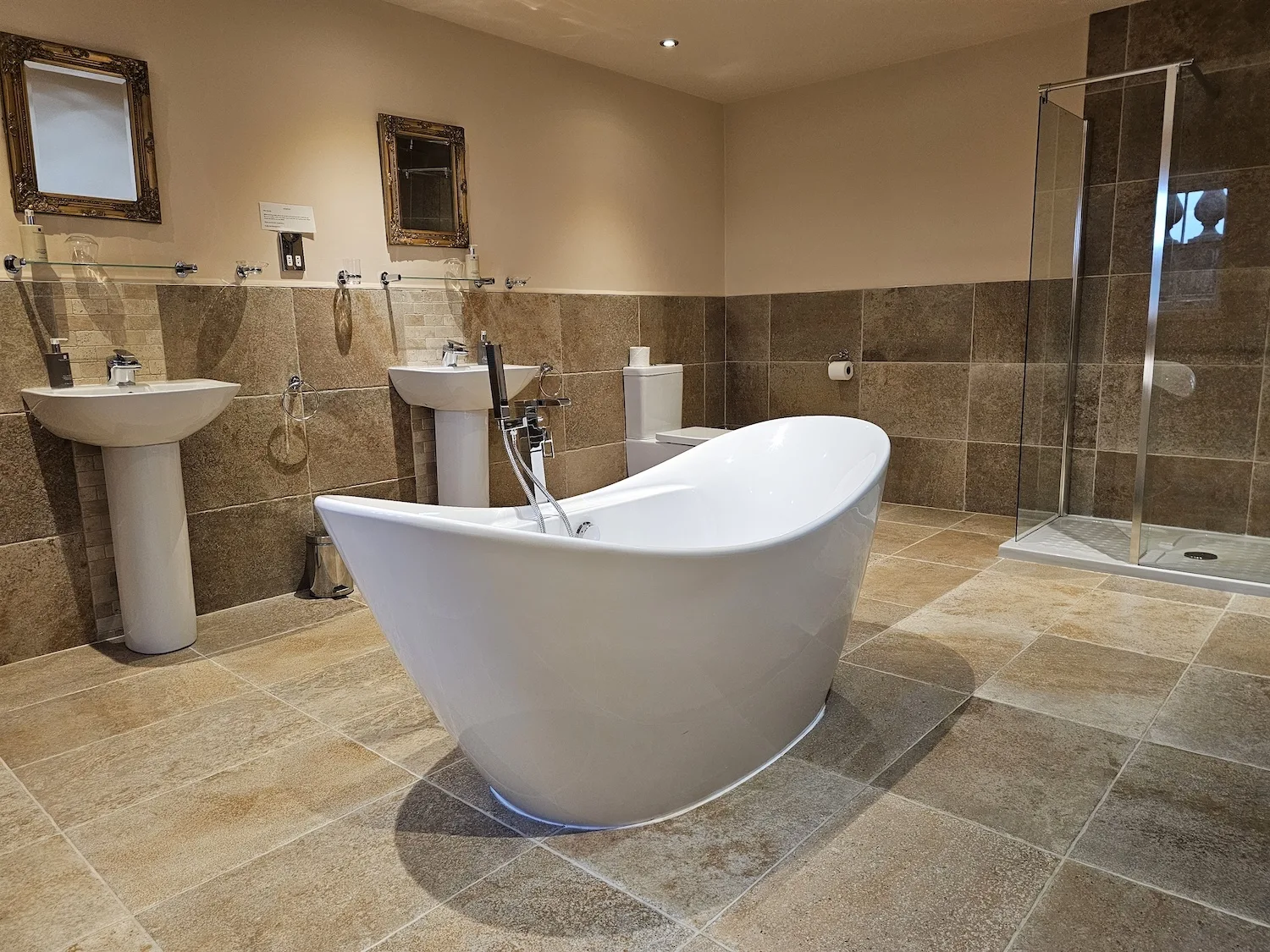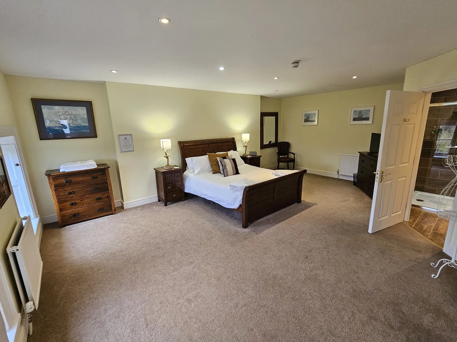 Everything’s on the ground floor, including a hallway, a living/dining room with a Smart TV, a fully equipped kitchen, one double bedroom with a bathroom, and another double bedroom with an en-suite shower. Both beds are zip-locked super-king size and can be split into 4 singles if you need.