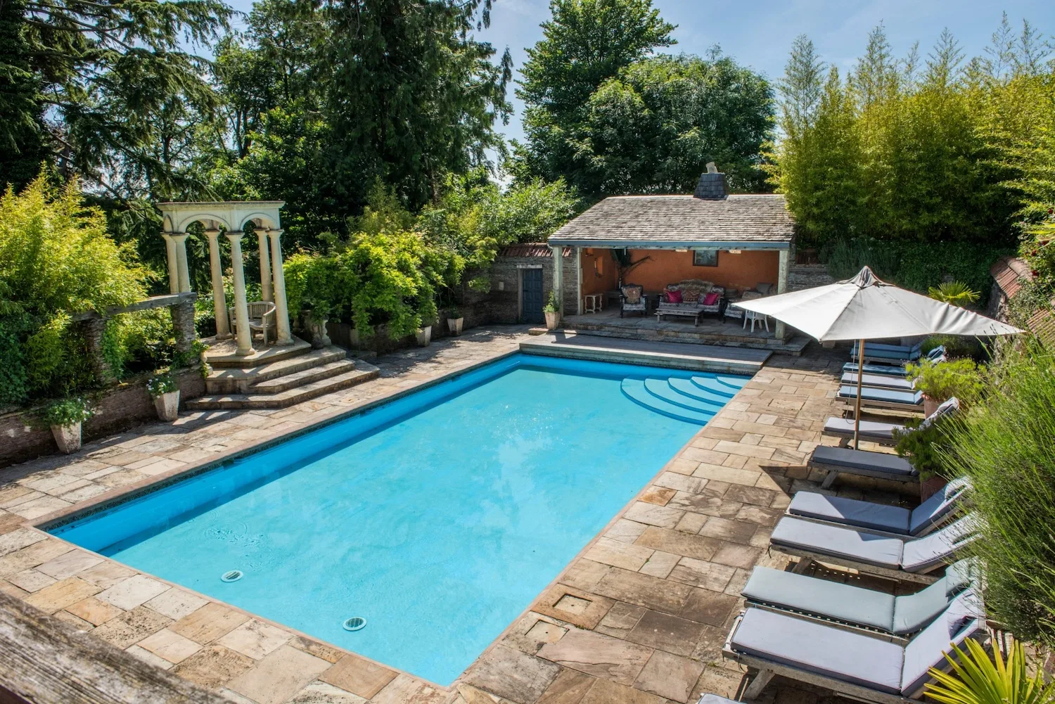 The standout feature has to be the stunning Mediterranean-style outdoor heated pool.