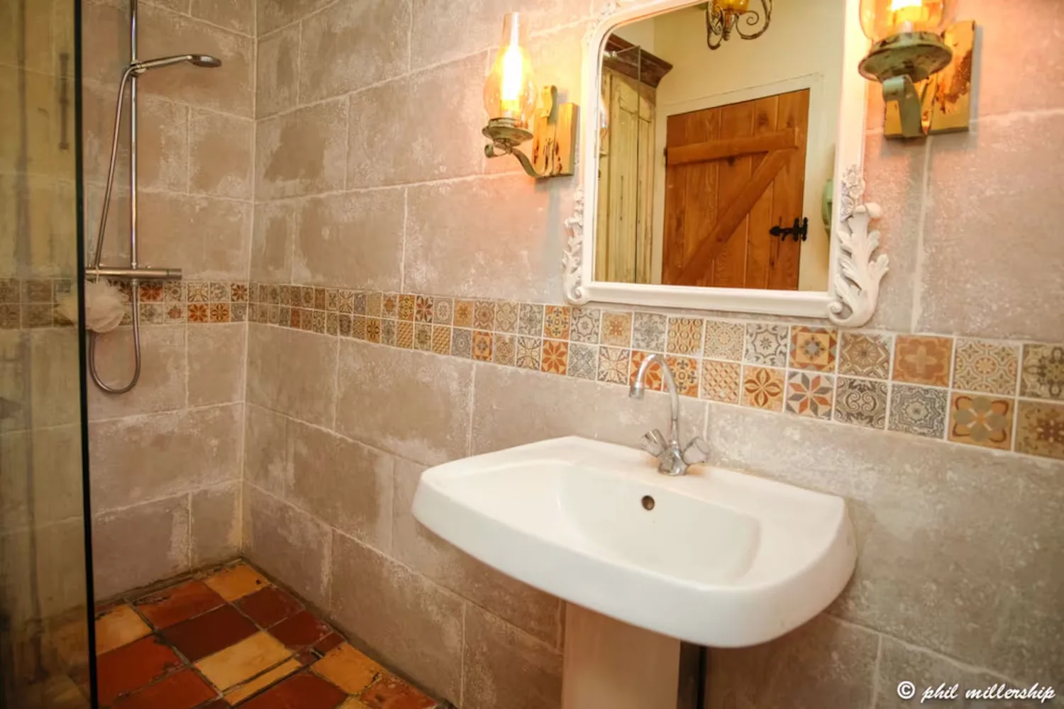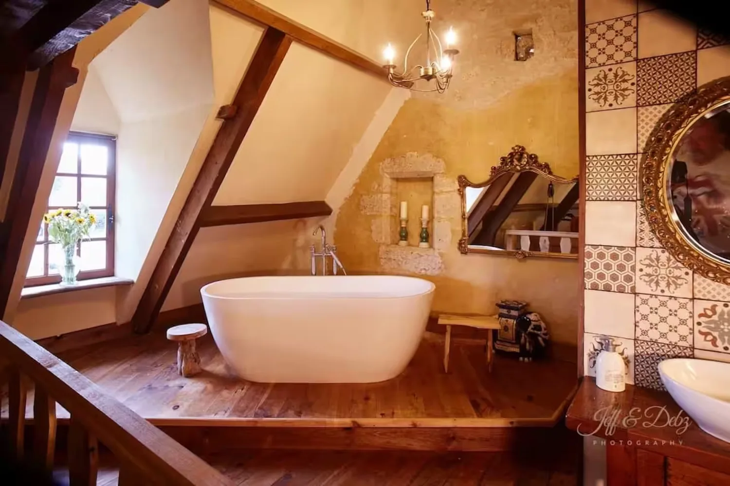 The main bedroom overlooks old walnut trees and has a freestanding bath big enough for two. Both downstairs bedrooms open straight out into the garden.