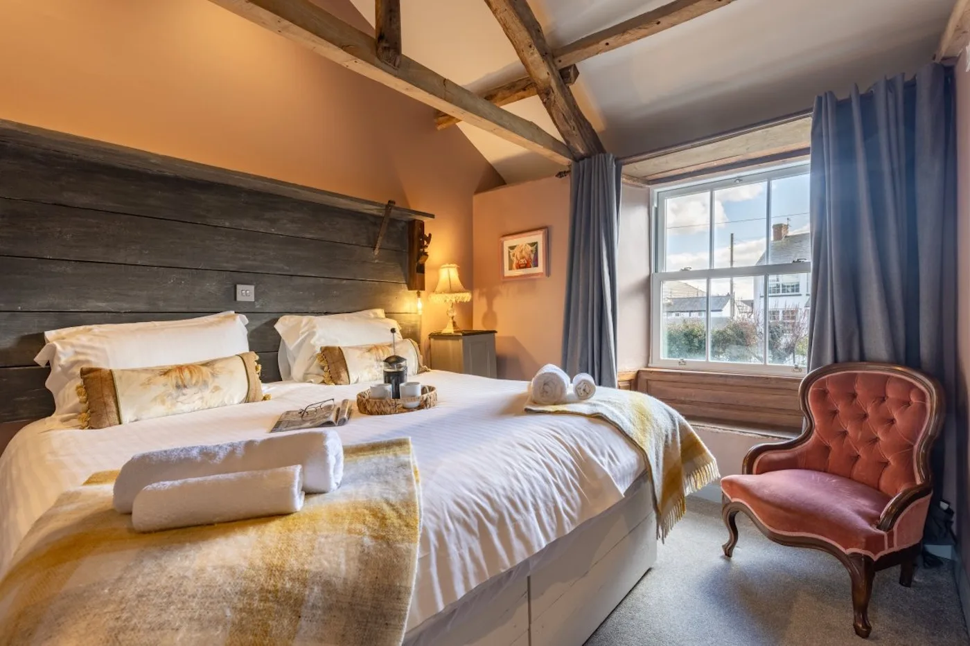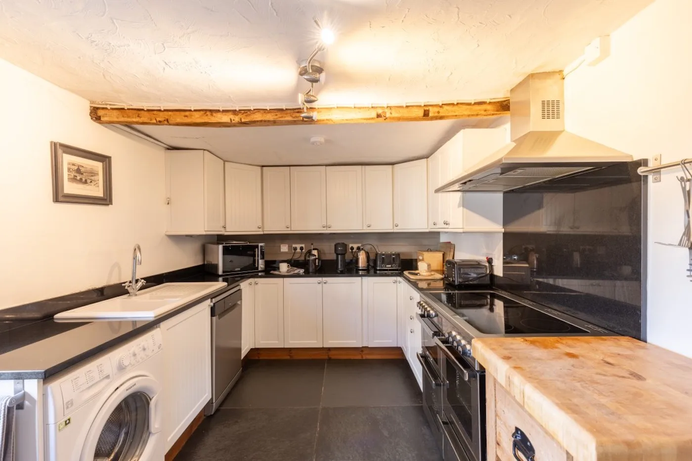 Inside, there’s an entrance porch with space for coats, wellies and buggies, leading into a cosy hallway. Off here, you’ll find a large lounge with deep sofas and a wood-burner, plus a dining room with another wood-burner and a big table perfect for long, lazy meals. A couple of steps take you down to the fully equipped kitchen, designed with large groups in mind – complete with a double range cooker and a big larder fridge-freezer.