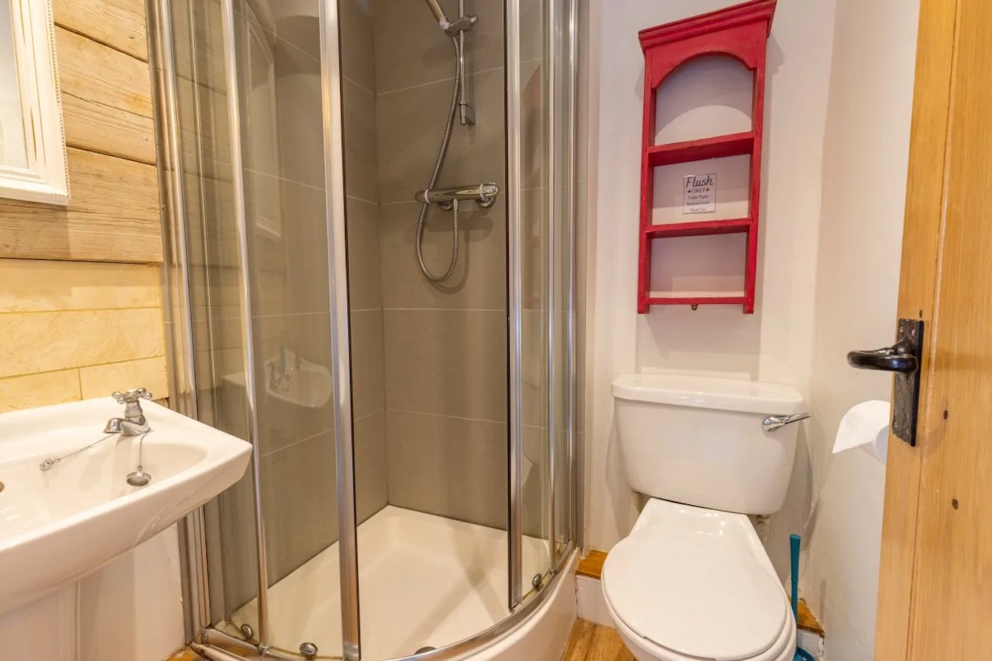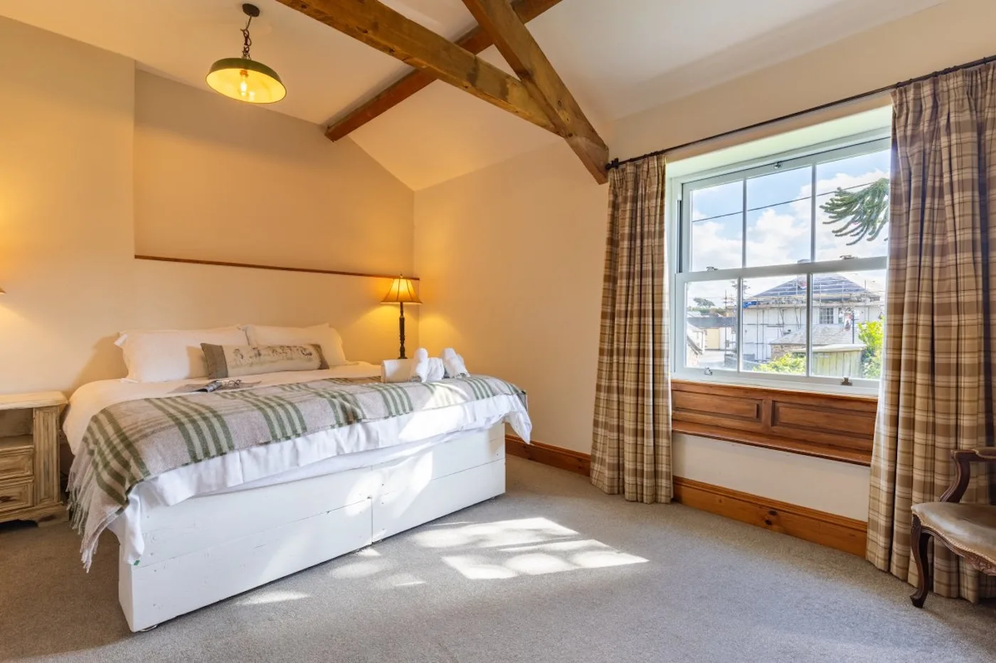 Upstairs, the long landing leads to a spacious master bedroom with zip-and-link beds, a vaulted ceiling, and its own bathroom with an over-bath shower. The bathroom can be private or shared, depending on what suits you best. There are also two double en-suite bedrooms with king-size beds, plus three twin bedrooms (two of which are en-suite and can be made into super kings on request). A second family bathroom with an over-bath shower completes the setup – and there’s room for cots in several of the rooms.