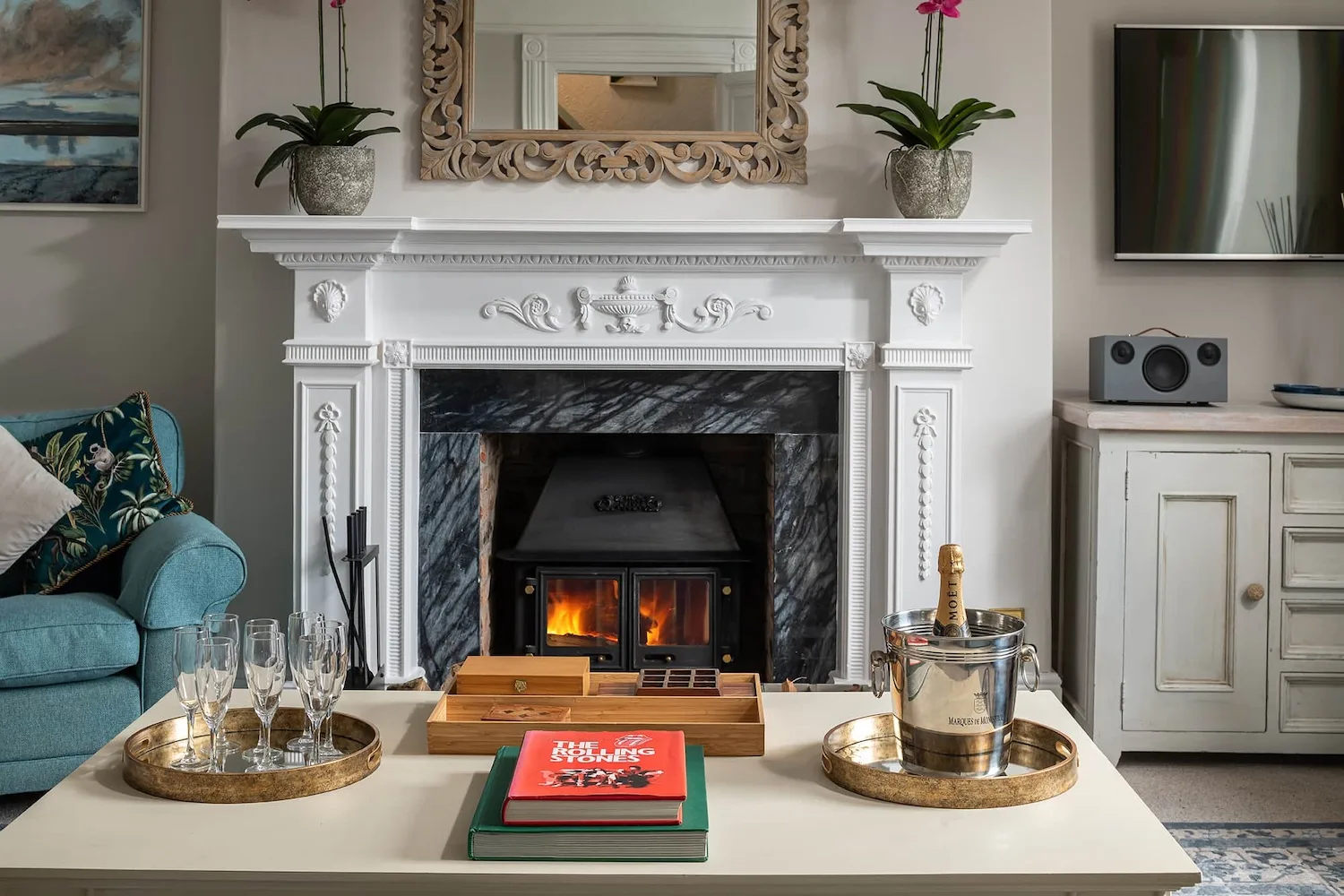 Downstairs, the hallway leads to a handy loo and a snug with a 50-inch smart TV, which opens into a well-equipped kitchen with a range cooker and farmhouse table. From the kitchen, you can wander into the garden room, where you’ll find table tennis and table football. This space leads out to a private, south-facing terrace with a hot tub, barbecue, sun loungers, and an outdoor rattan dining set.
