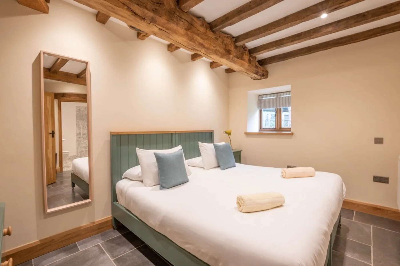 A simple, ensuite bedroom, ideal if you don’t need cooking facilities or want an extra room for a larger group. It has a double bed that can be twin or super-king, a colour TV, music system, kettle, and small fridge. The ensuite bathroom has a shower, sink, and toilet. Countryside walks and a great pub are just steps away.