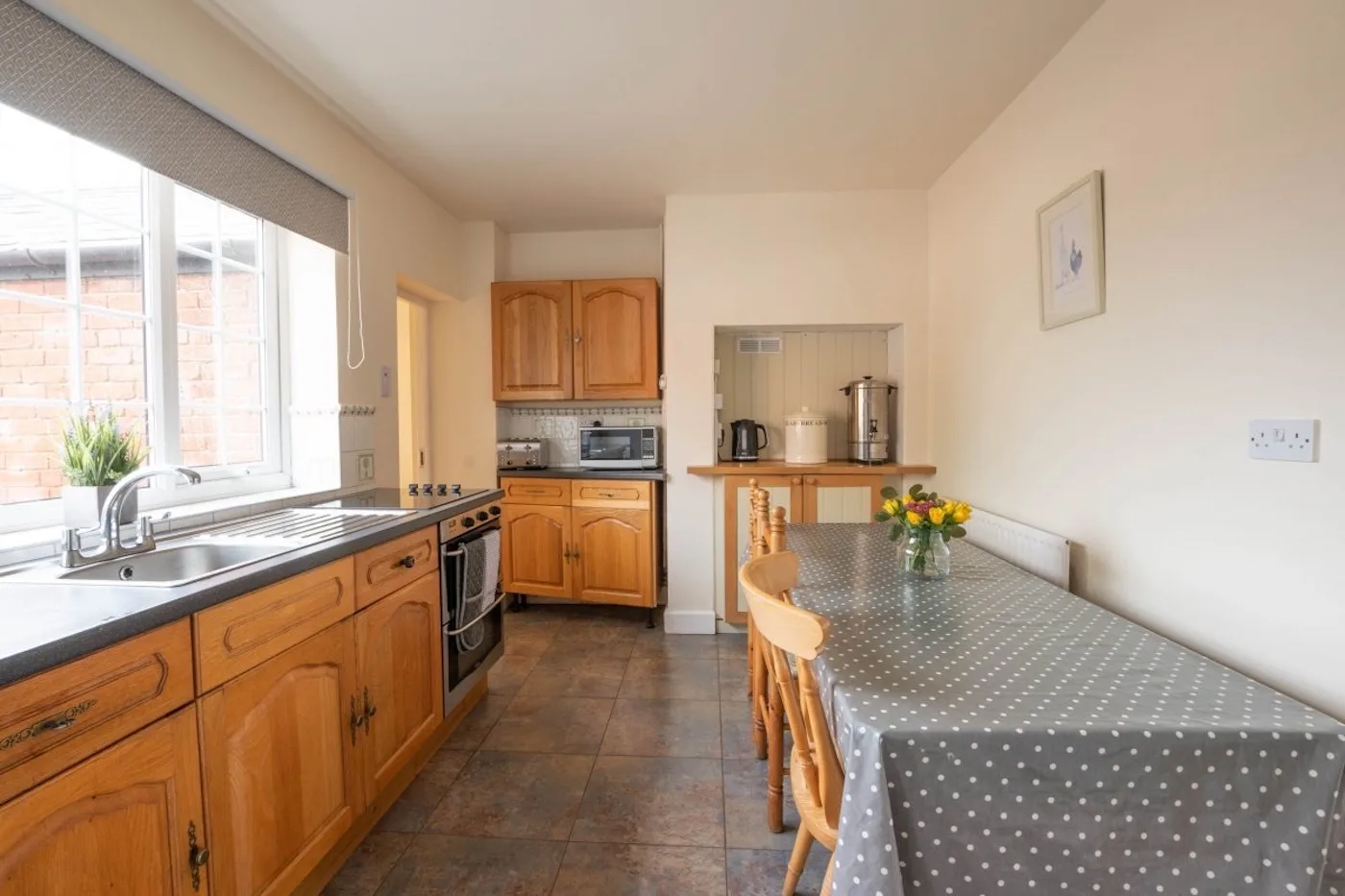 The two properties are linked together and rented as one, giving larger groups plenty of flexibility. You can cook and eat all together or split off if you fancy, with 2 kitchens, 2 lounges (both with TVs) and a big communal dining room. There are also 2 bedrooms and toilets on the ground floor, which is handy for anyone who’s less mobile.