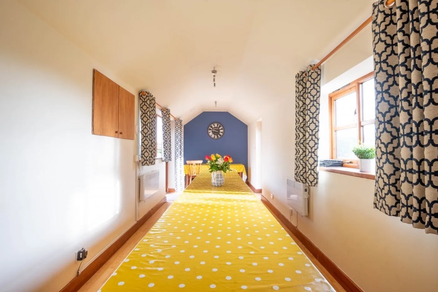 The kitchens open into a large dining room that you can access from either side, with seating for up to 22 people.