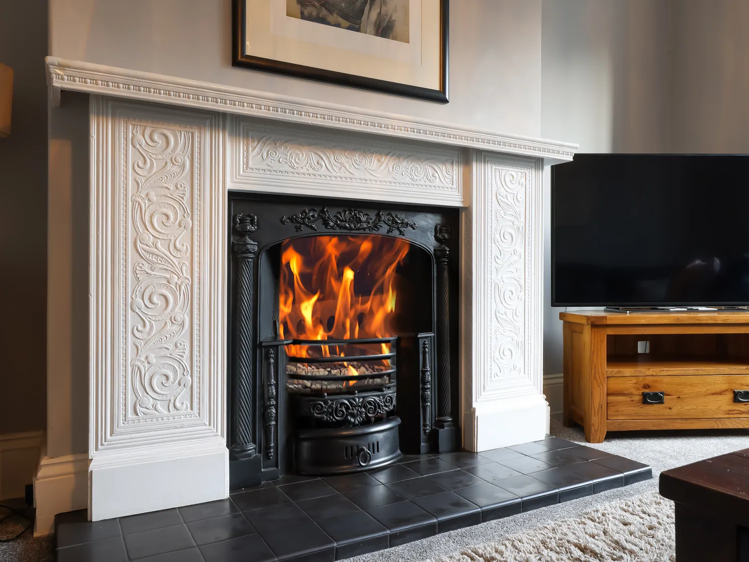 At the front, the sitting room is stylishly decorated in soft greys, blacks and creams. There’s a huge corner sofa, a Smart TV, and a gas fire set in an ornate fireplace — the perfect spot to unwind together after a fun-filled day.