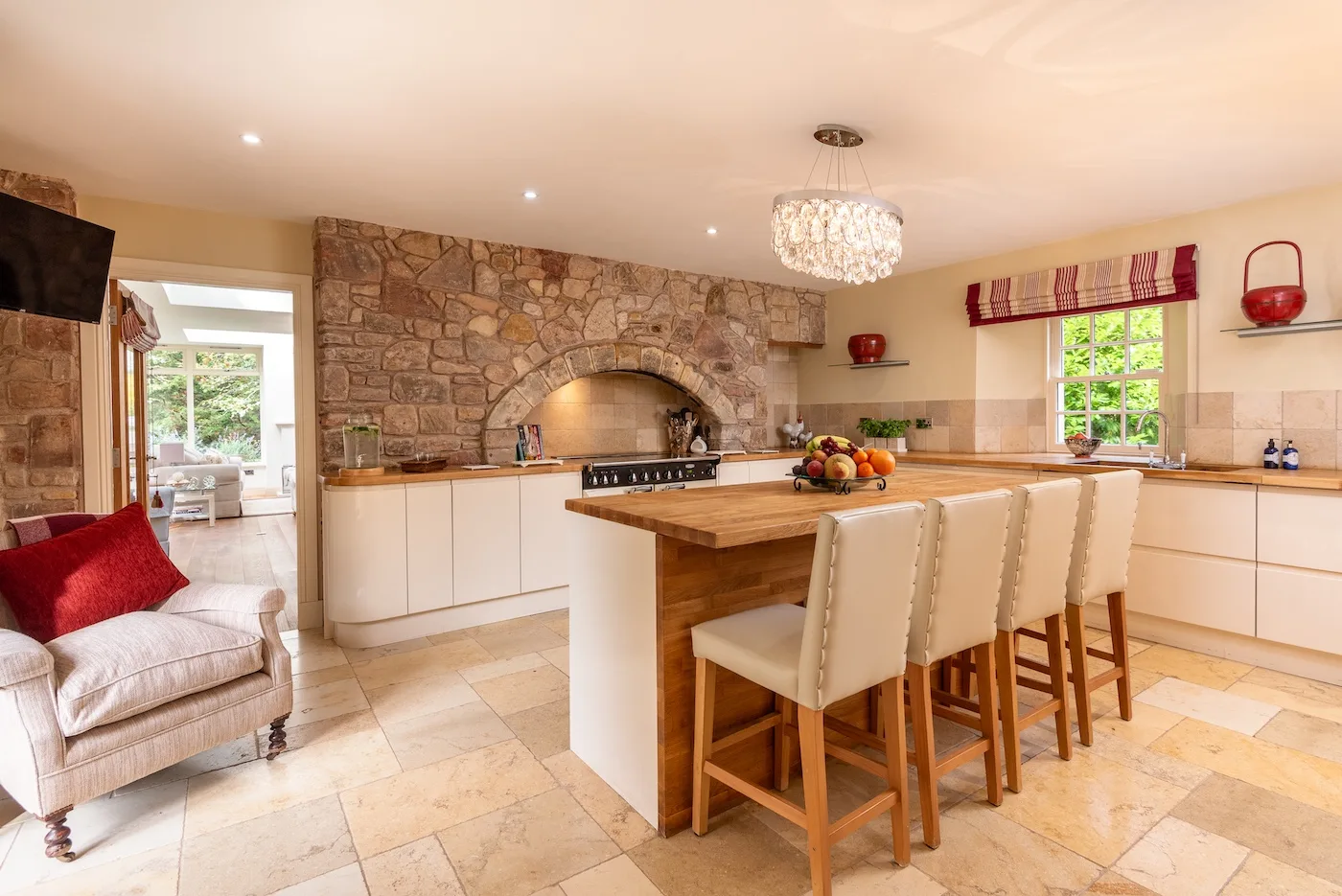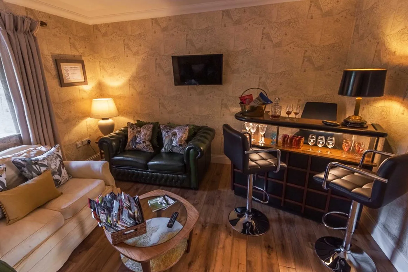 Tucked away is the snug, a perfect little hideaway with leather armchairs, soft lighting, and a bar – ideal for a whisky tasting or a quiet evening in.