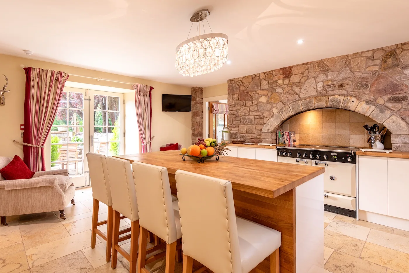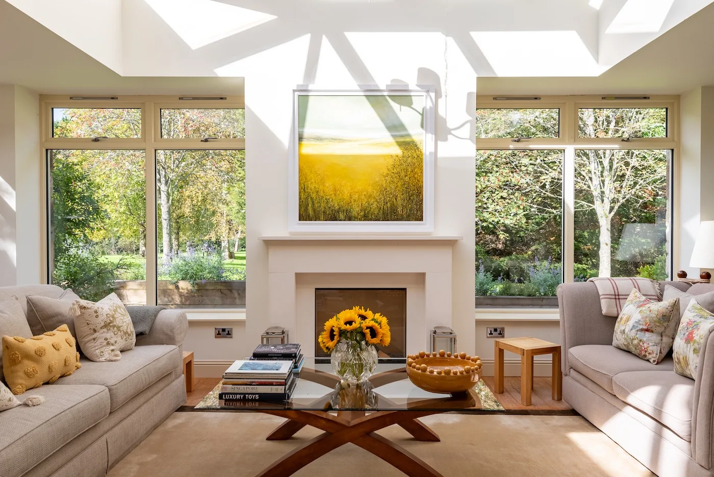 The Orangery is light and airy, with windows on three sides overlooking the gardens. The large oak dining table seats ten, the sofas are super comfy, and the modern, remote-controlled fireplace adds a lovely cosy vibe.