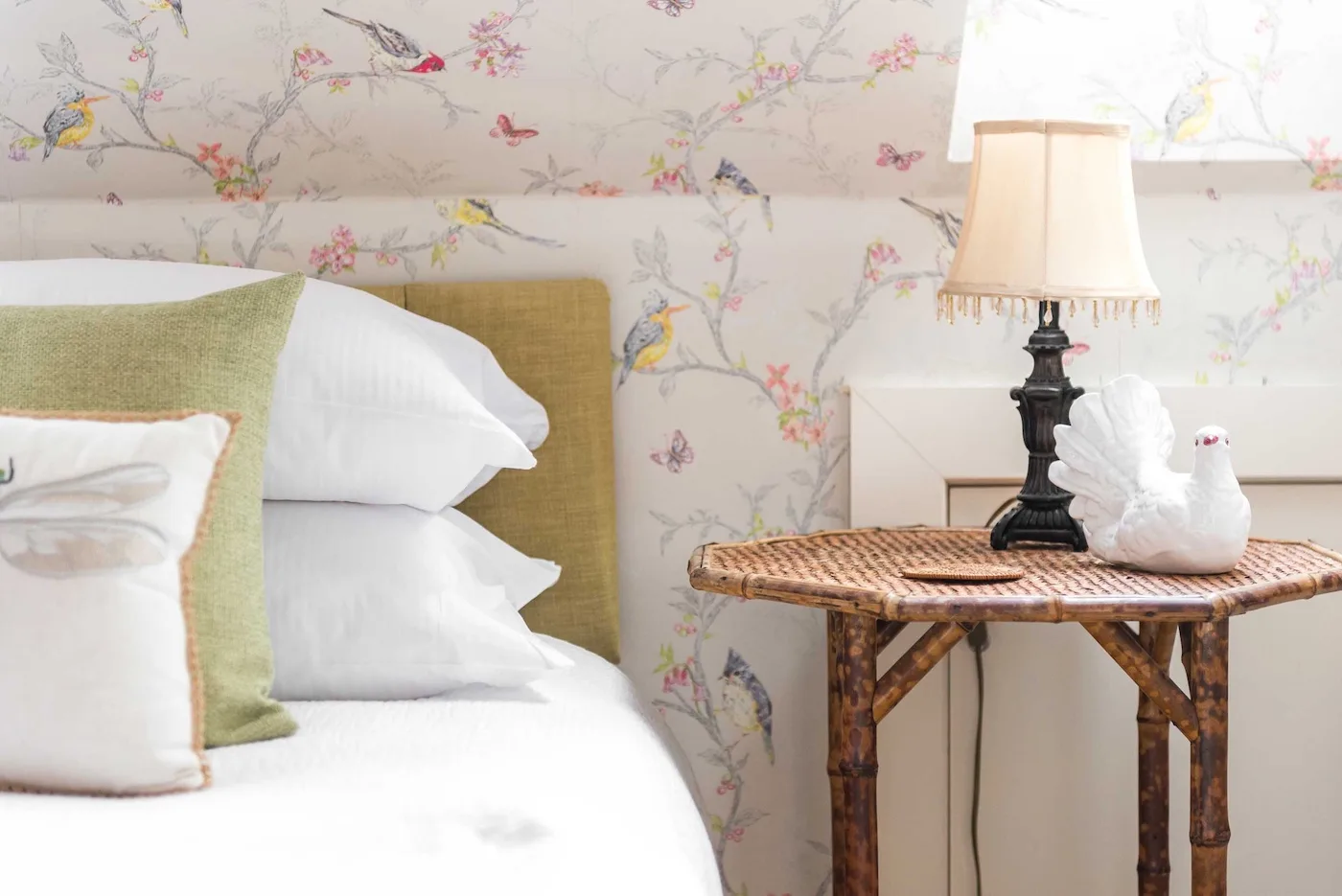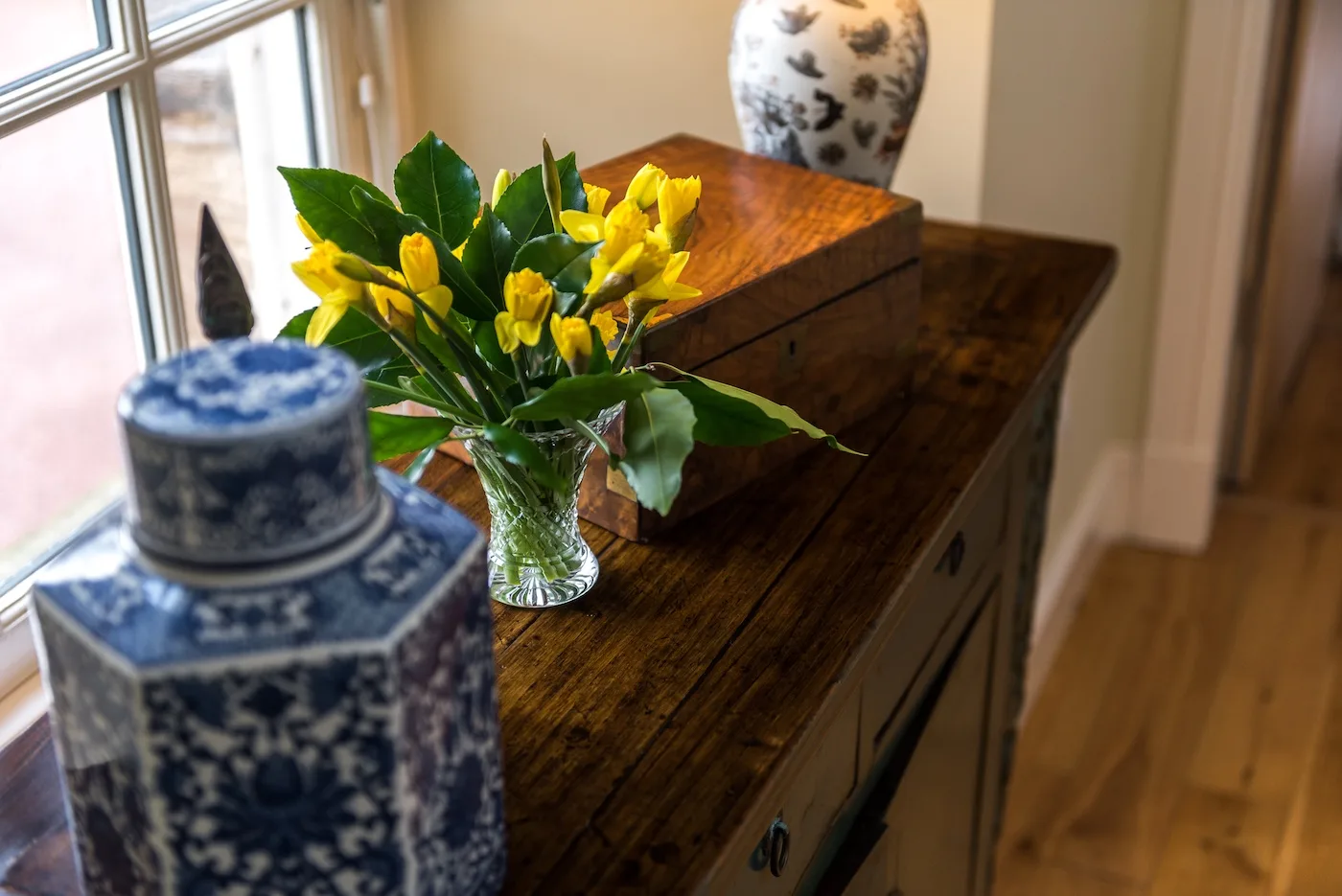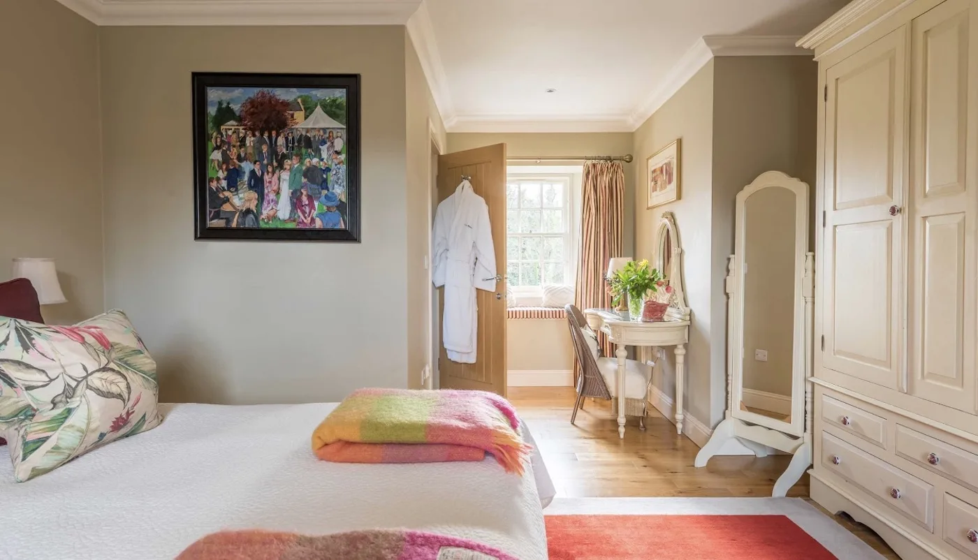 The dining room is full of character, with rich textiles, Indian silks, and quirky ornaments. Guests love the crackling log fire, and the window seats are the perfect place to curl up with a good book while taking in garden views.