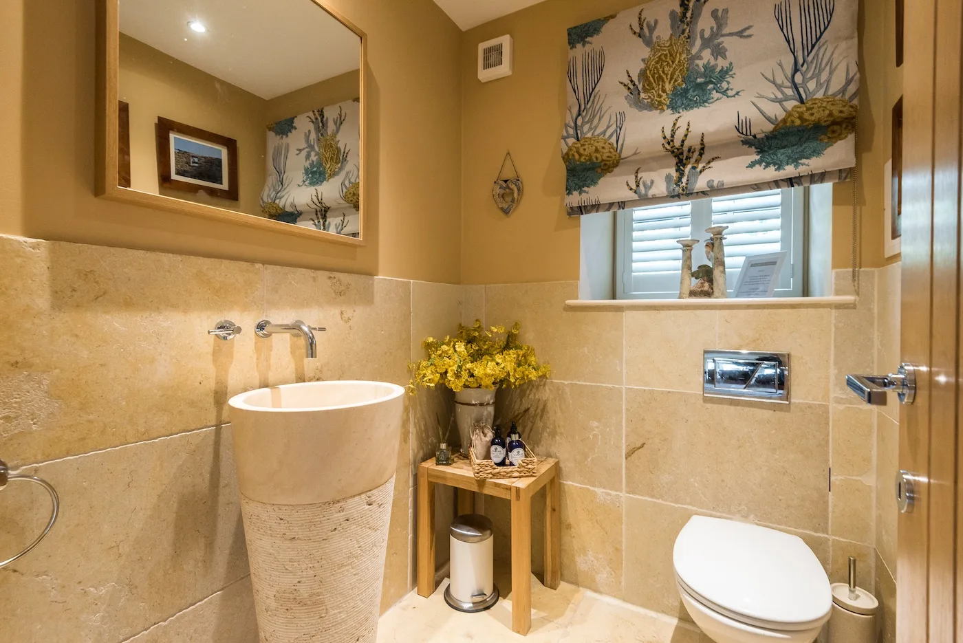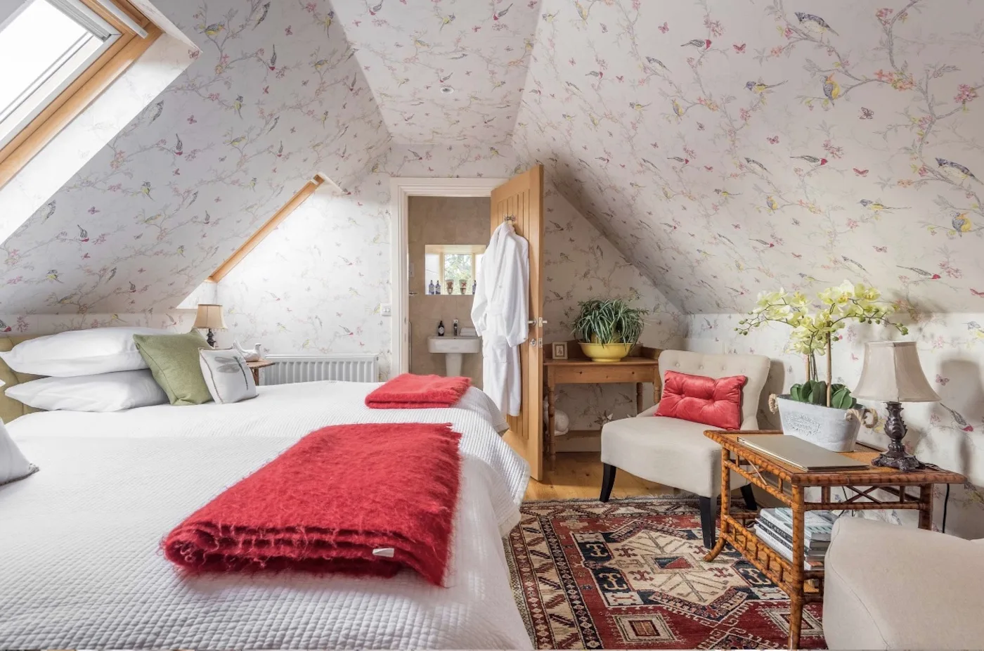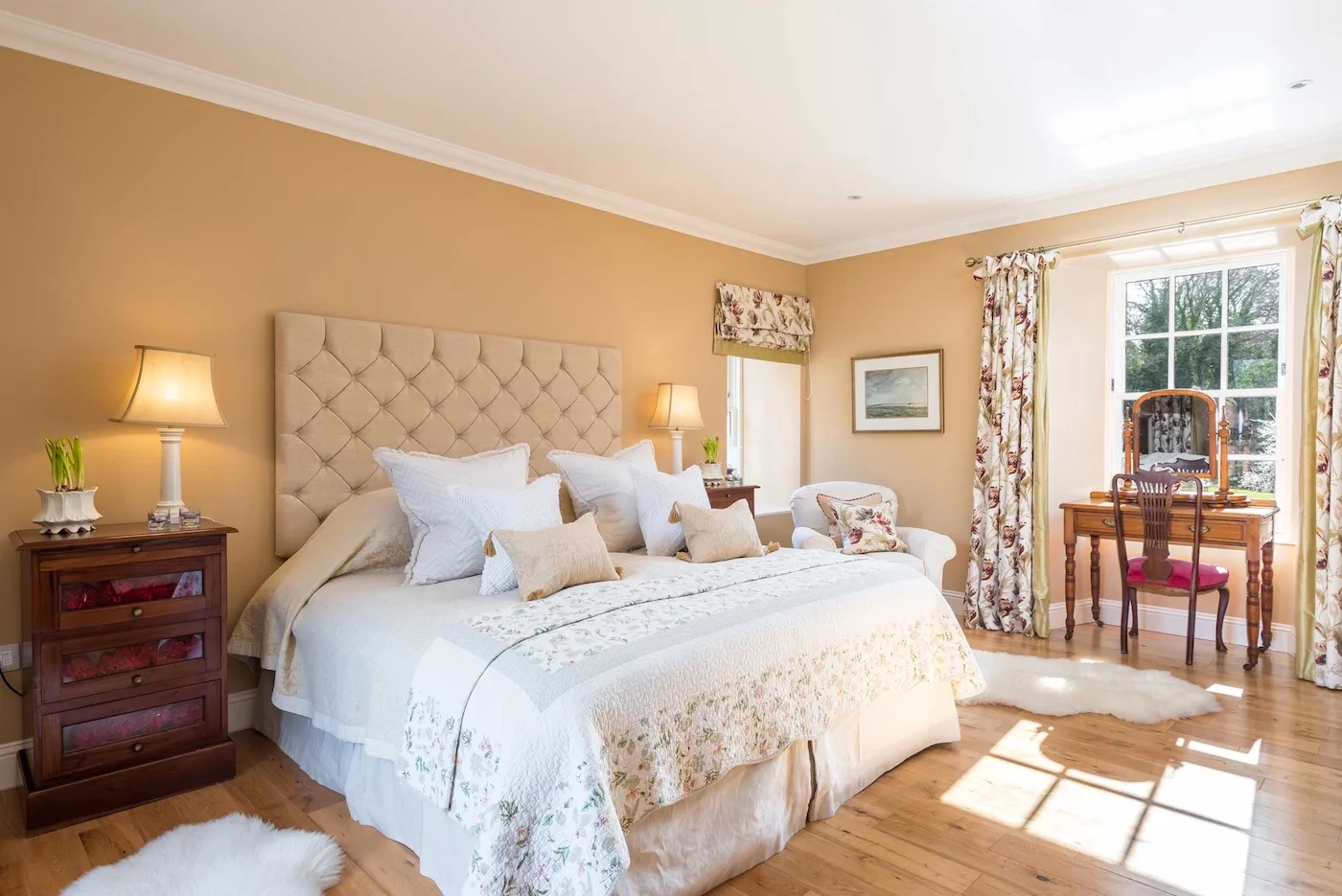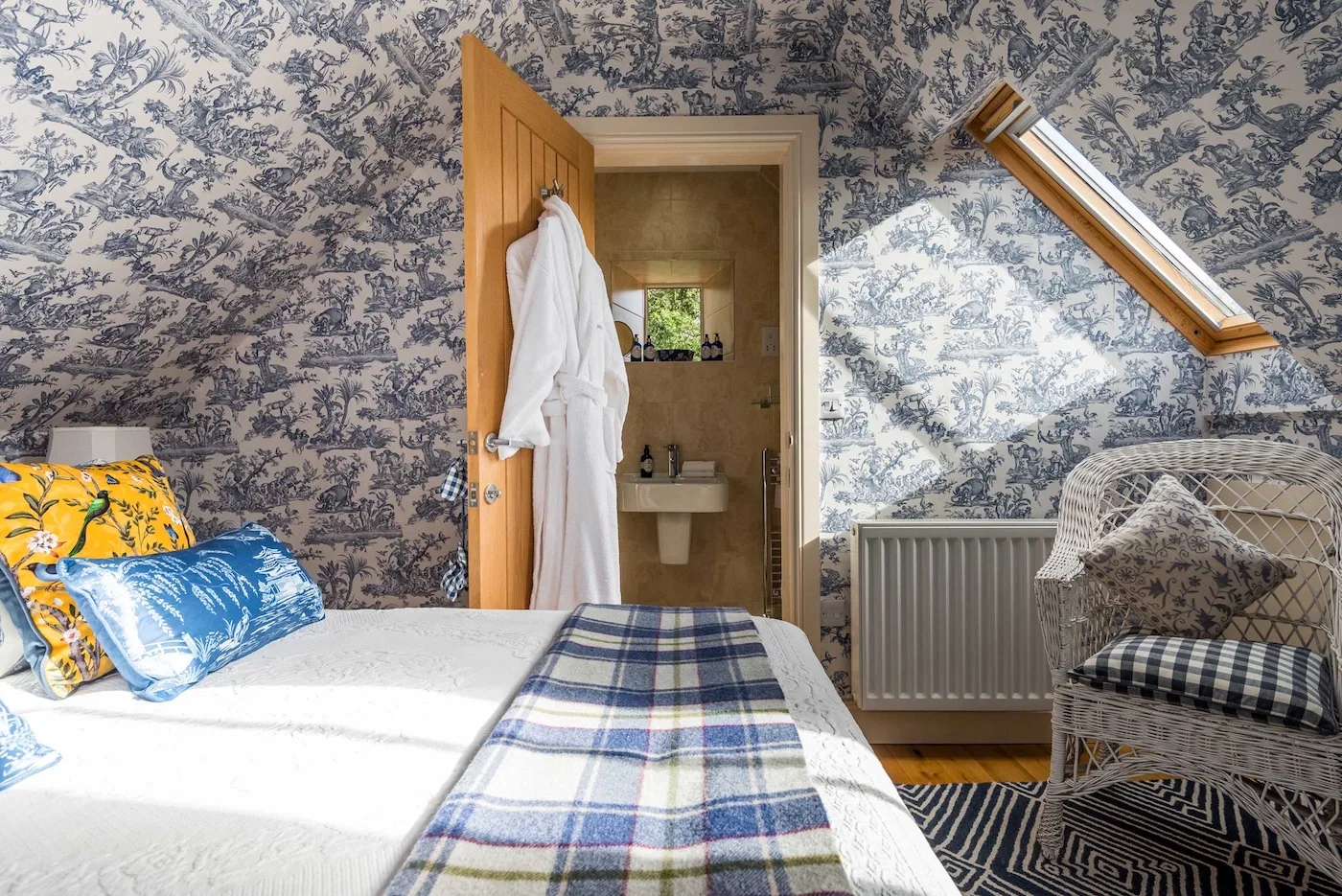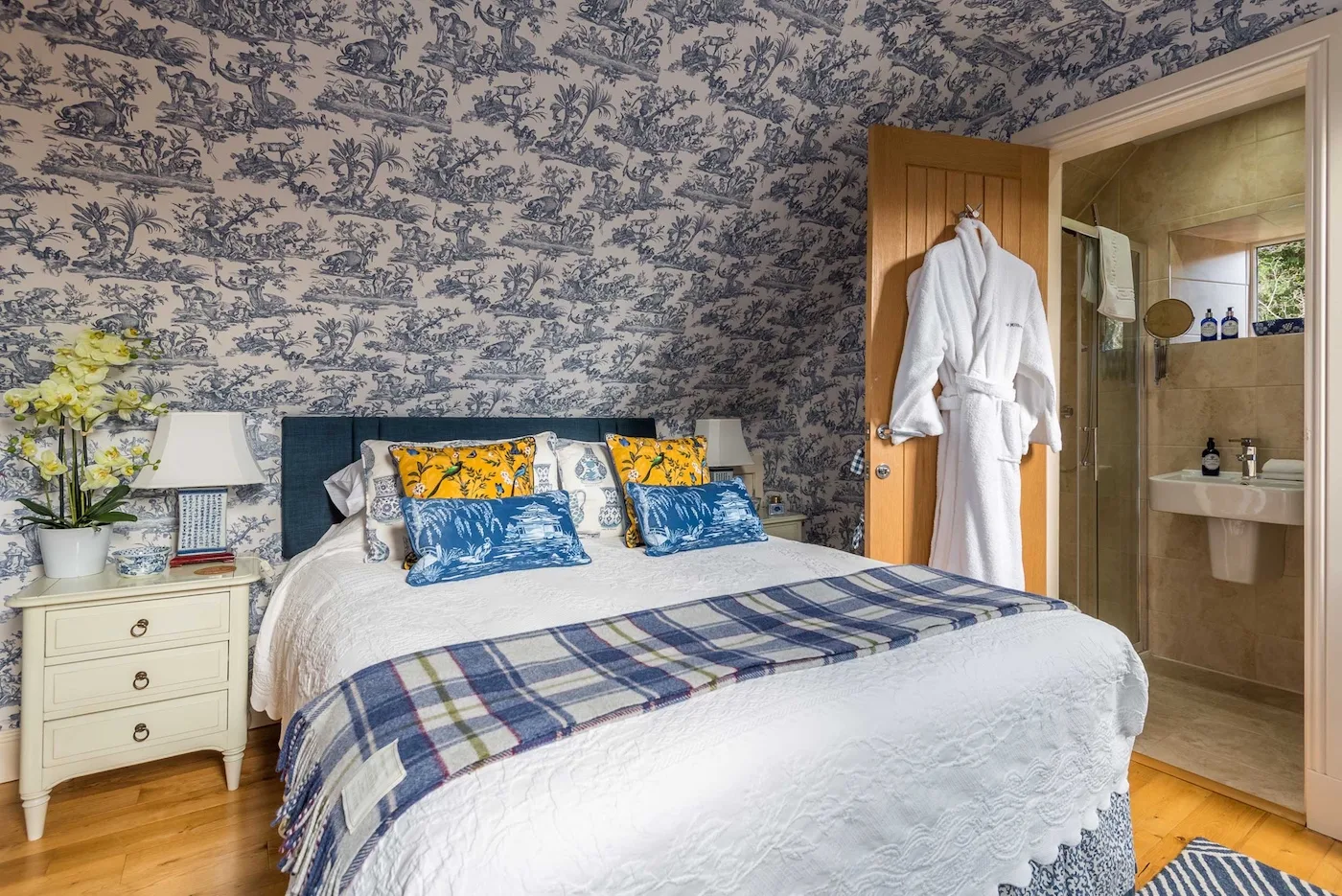 All five en-suite bedrooms (four super king, one twin) are individually styled with wool and cashmere beds, feather and wool duvets, and locally sourced organic toiletries. For extra comfort, we provide bathrobes, fluffy towels, and house slippers.