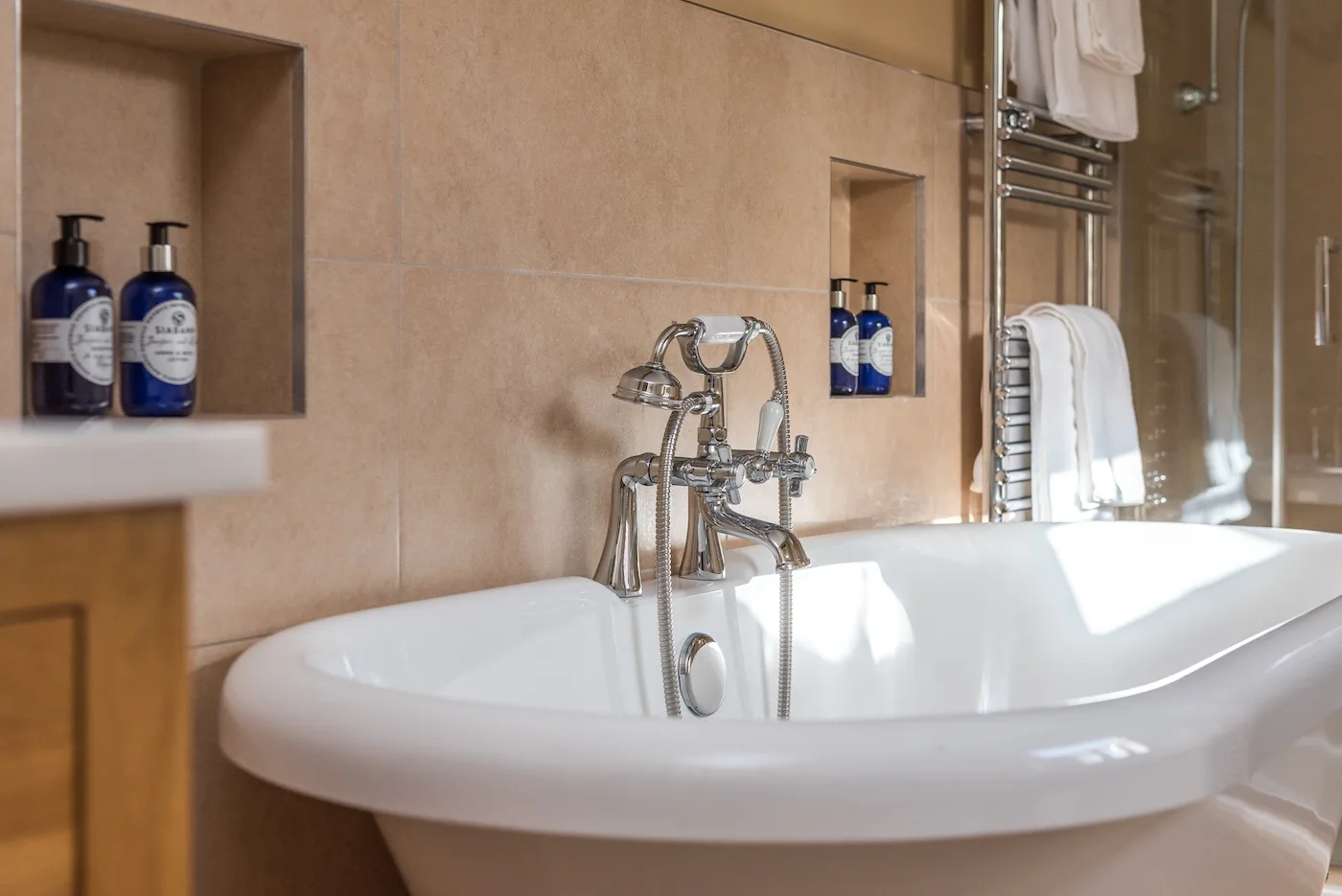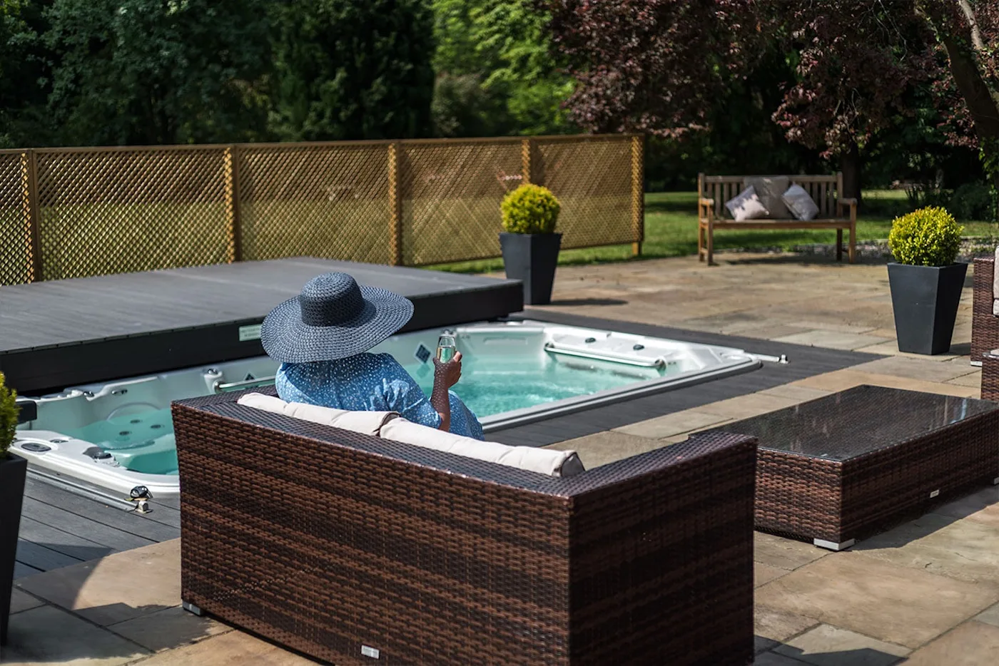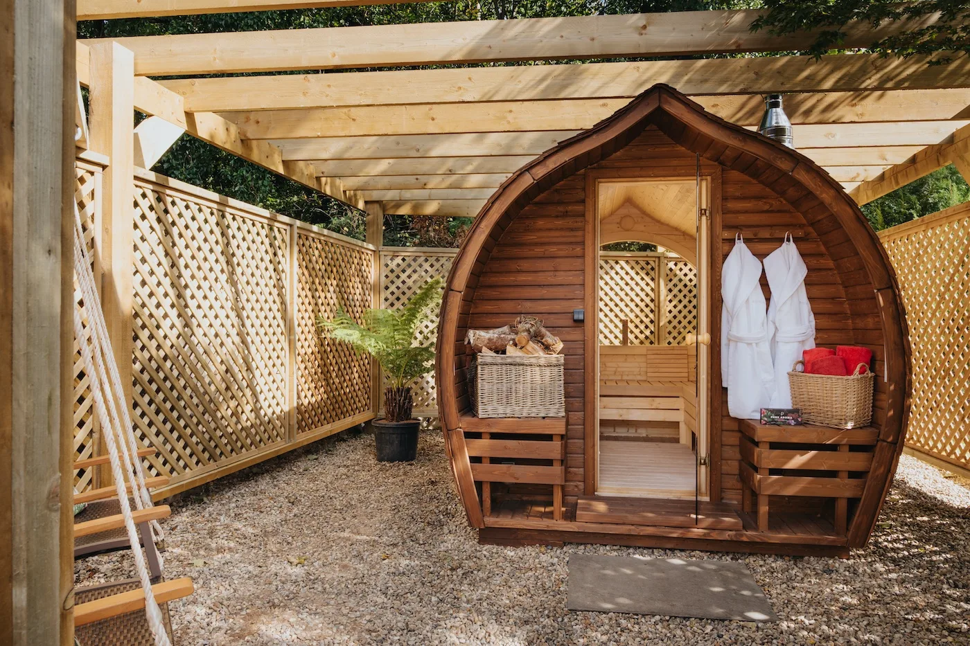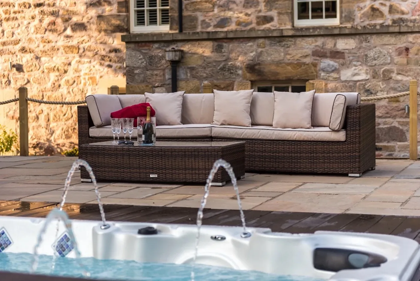 The hot tub comfortably fits four adults, with hydrotherapy jets for the ultimate relaxation. We provide robes, spa towels, and flip flops, so you can enjoy the garden loungers with a drink straight after.
