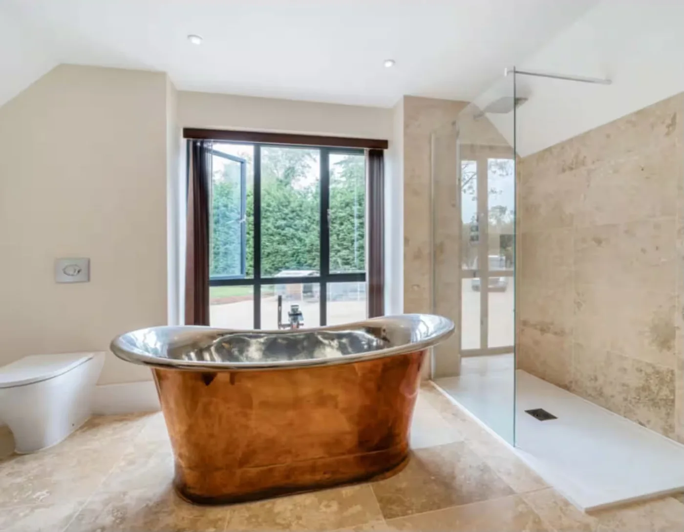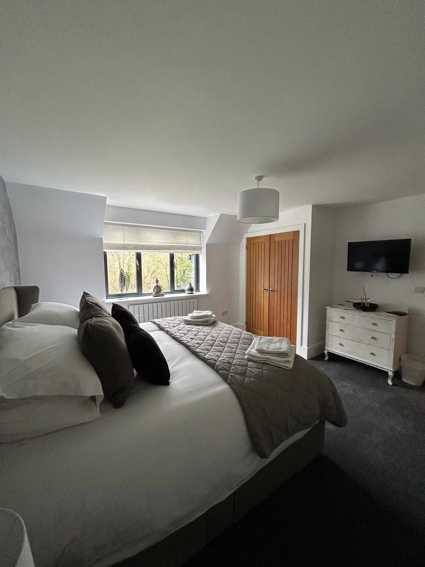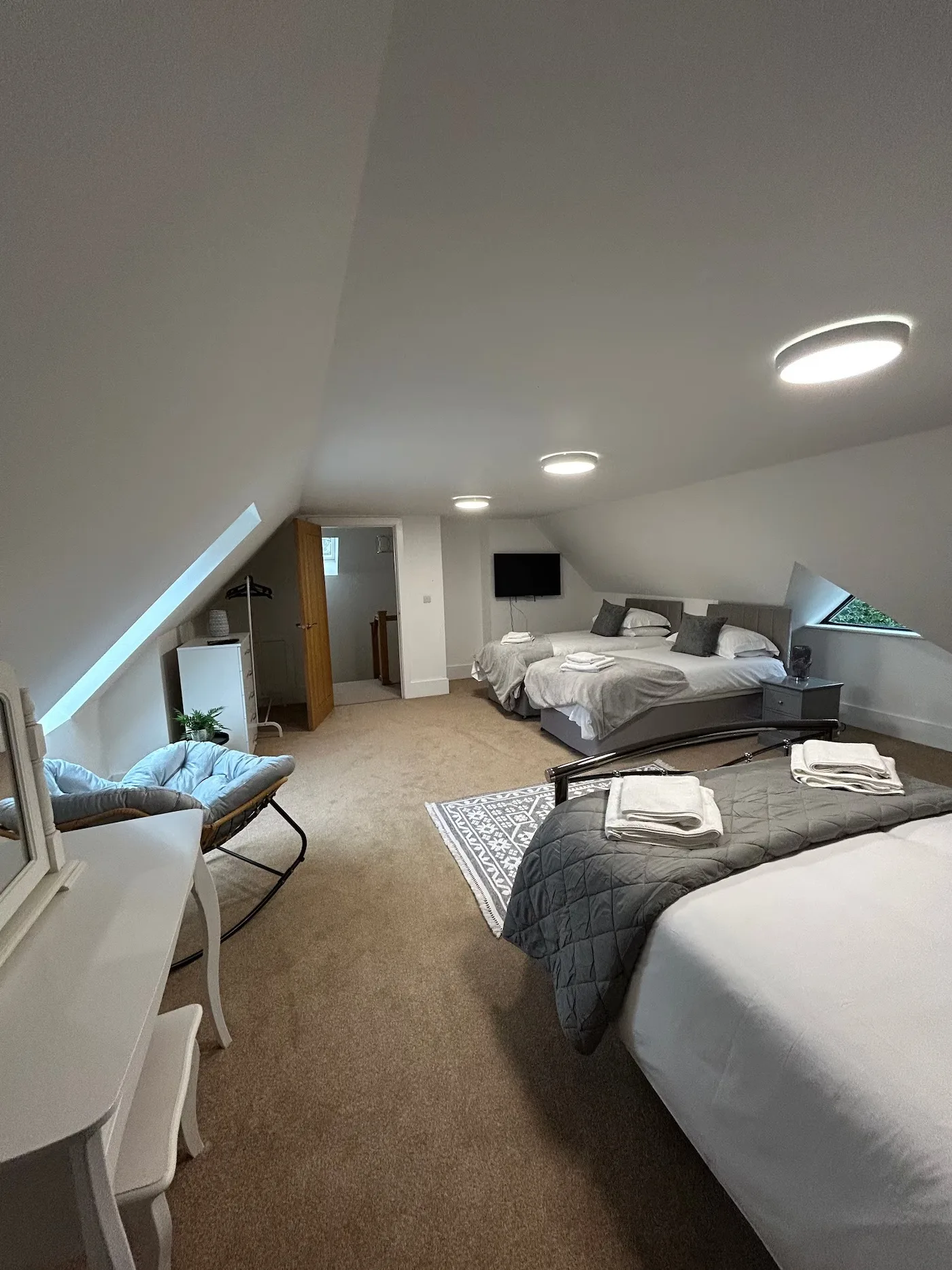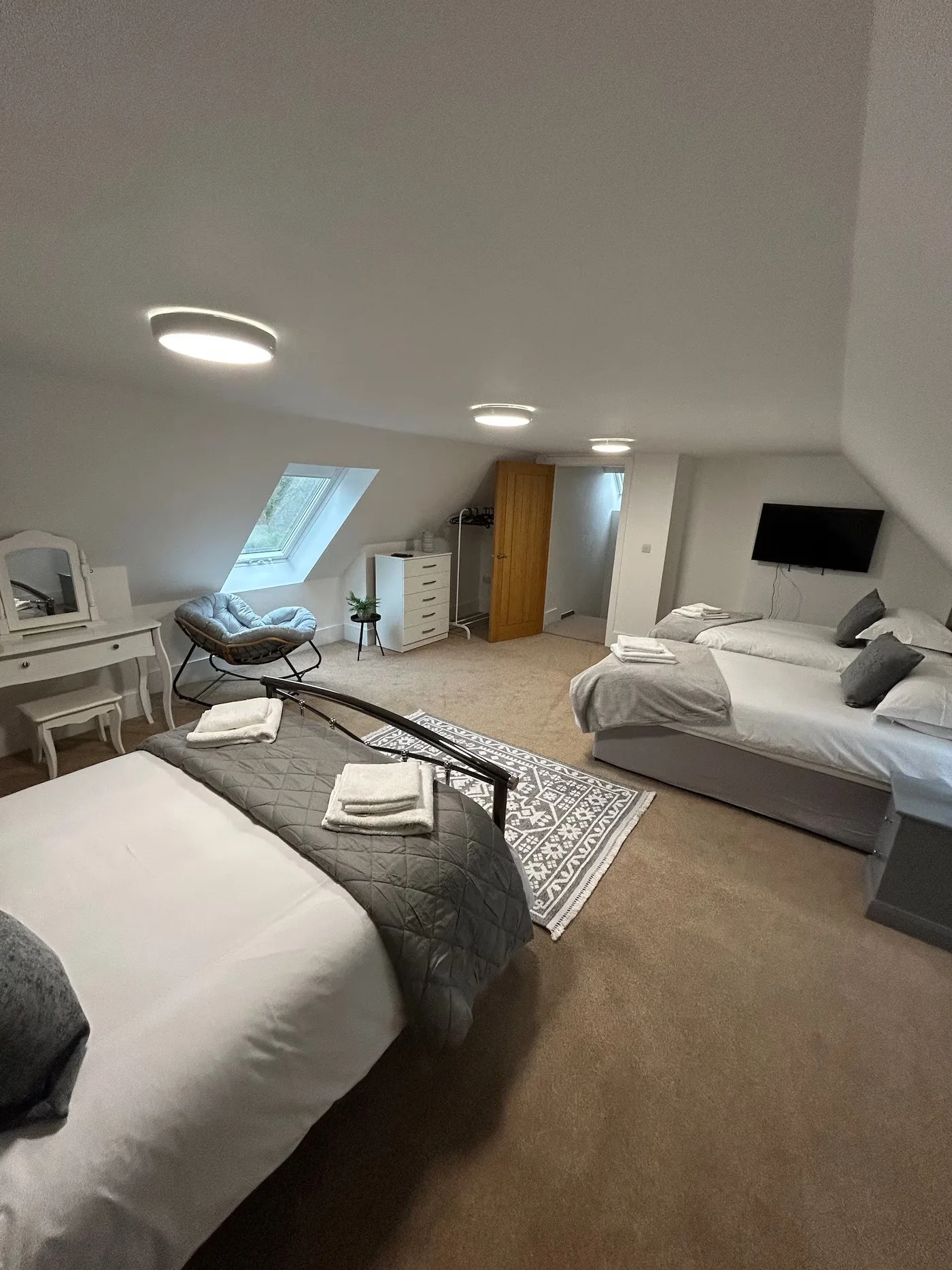 Inside, there’s loads of space with five bedrooms upstairs and three bathrooms. Sleeping arrangements are flexible, with super king, king, double and family-friendly options—all with comfy beds, storage, TVs and soft lighting. The master suite has its own balcony overlooking the garden, plus a luxury en-suite with a copper bath.