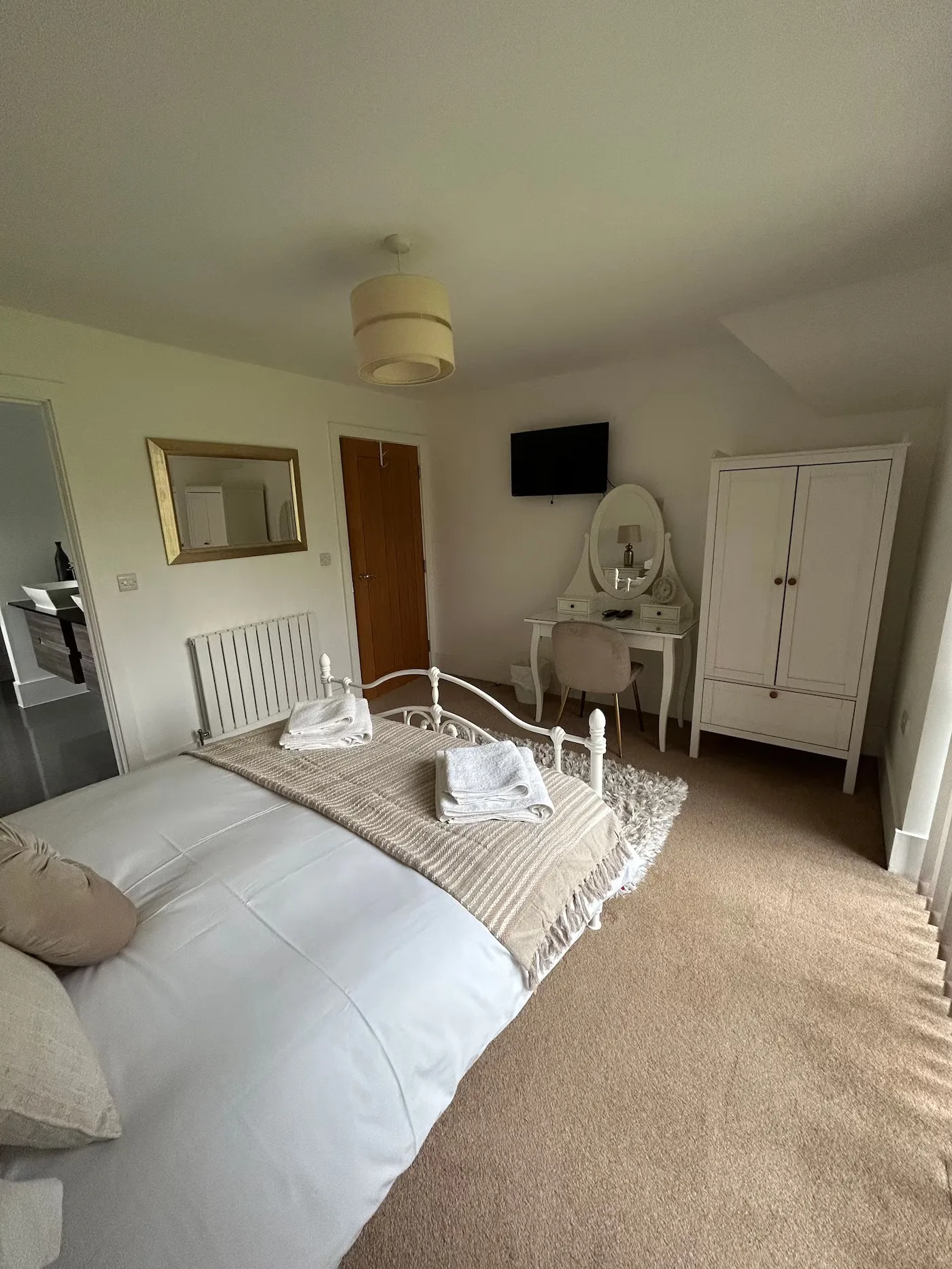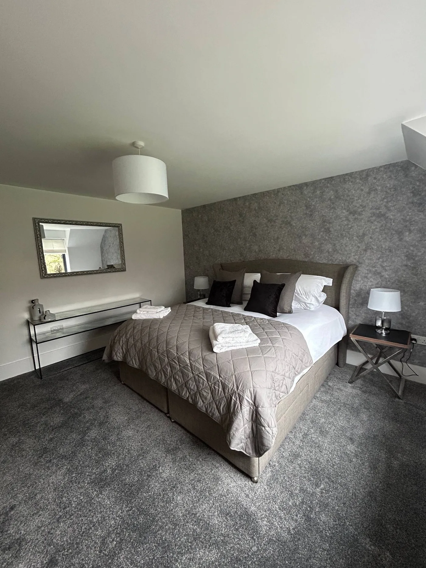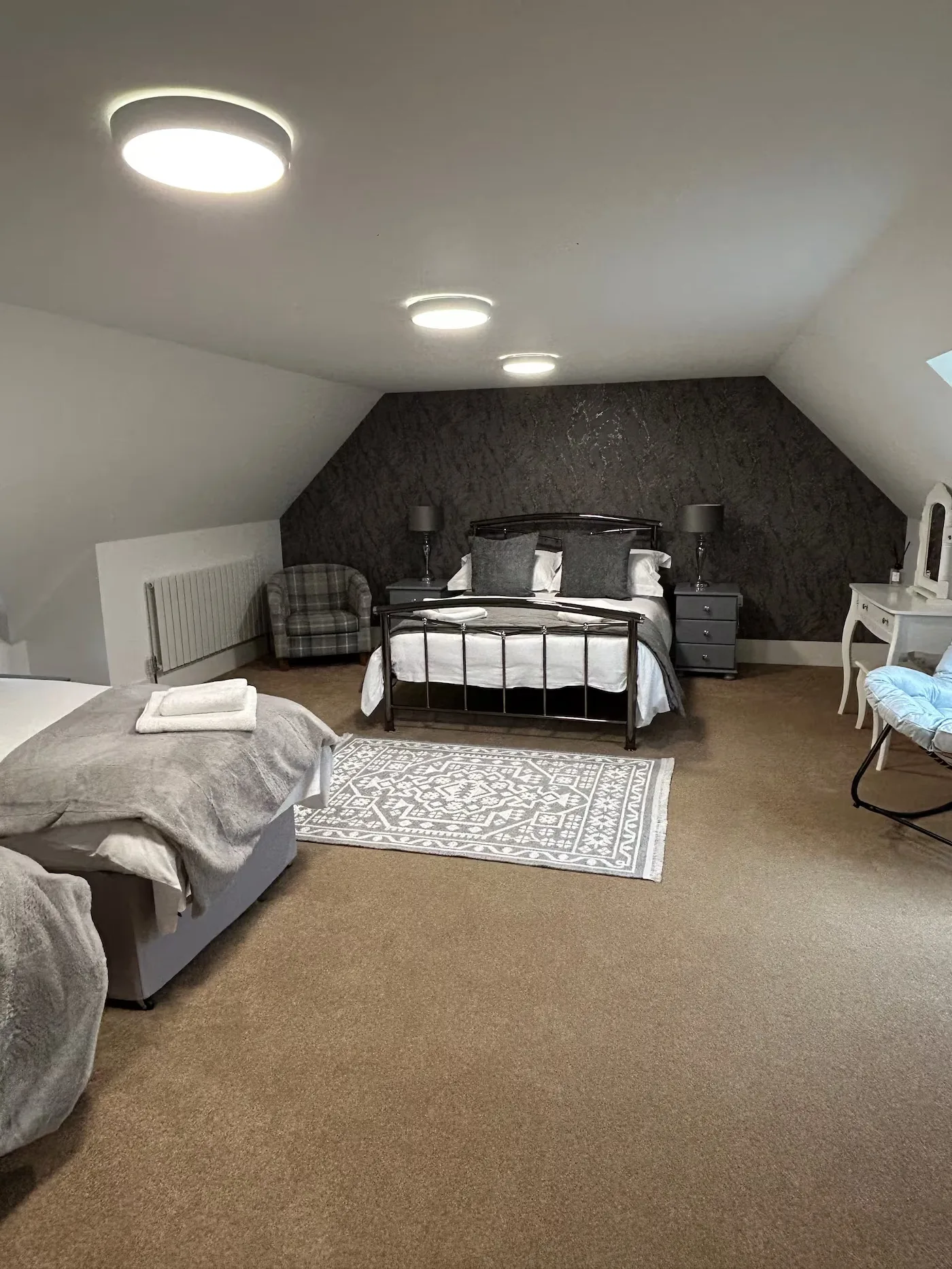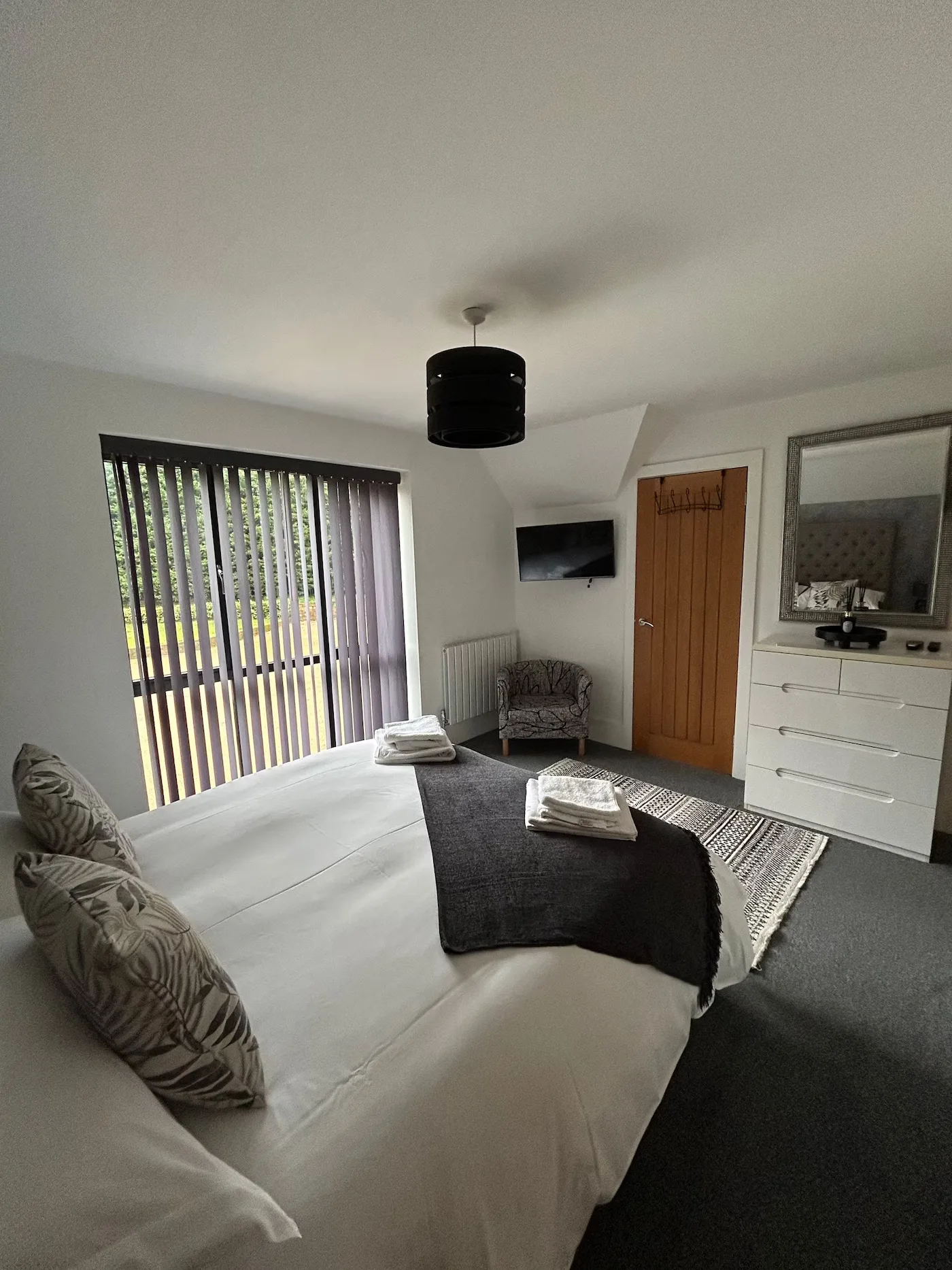 Inside, there’s loads of space with five bedrooms upstairs and three bathrooms. Sleeping arrangements are flexible, with super king, king, double and family-friendly options—all with comfy beds, storage, TVs and soft lighting. The master suite has its own balcony overlooking the garden, plus a luxury en-suite with a copper bath.