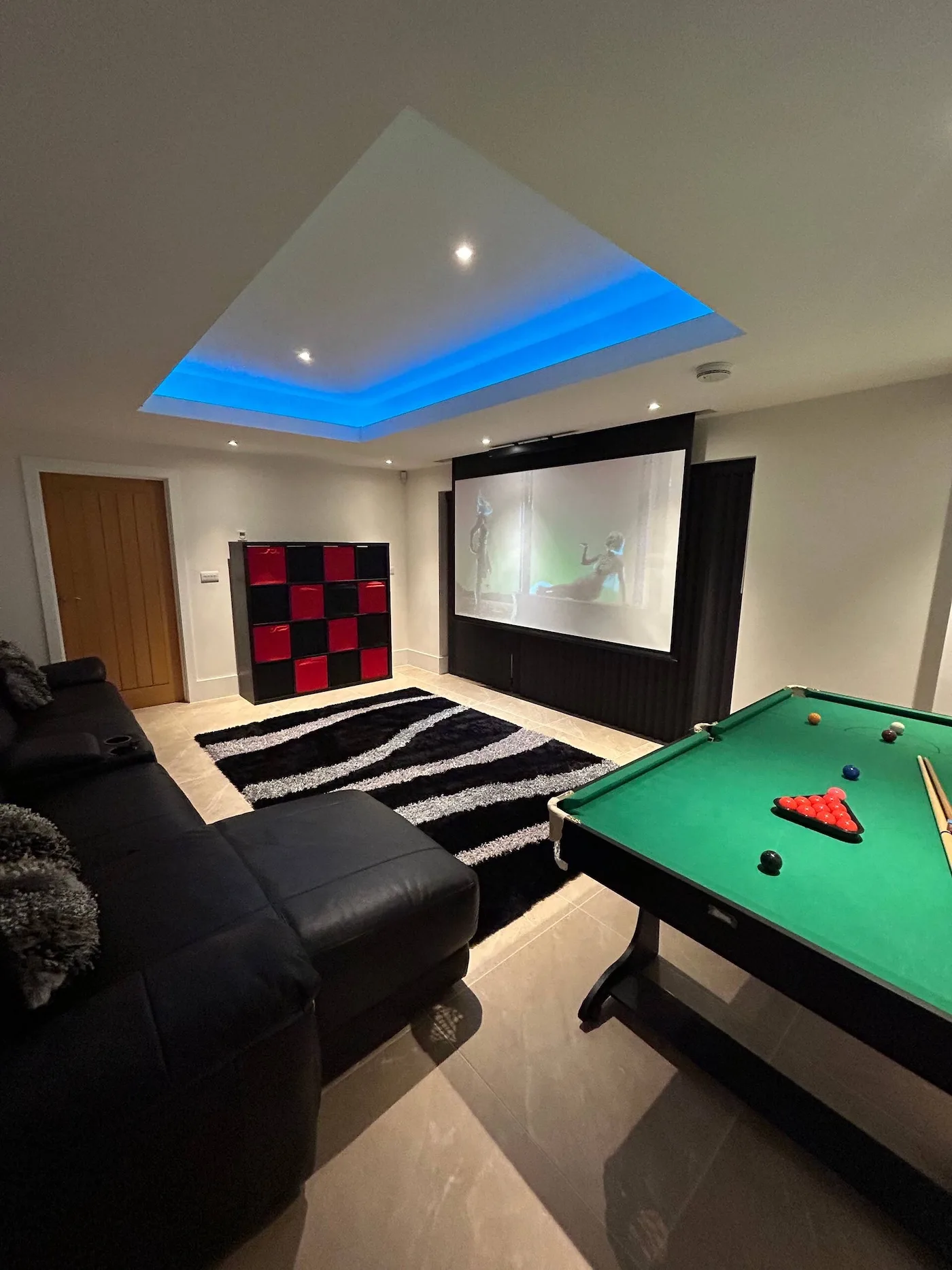 The heart of the home is the big open-plan kitchen and dining area, fully equipped and with a table that seats up to 14—ideal for group meals and get-togethers. Bi-fold doors open out onto the patio and garden. There’s also a utility room, a chill-out space with a pool table and cinema setup, and a cosy living room with a log burner and garden access.