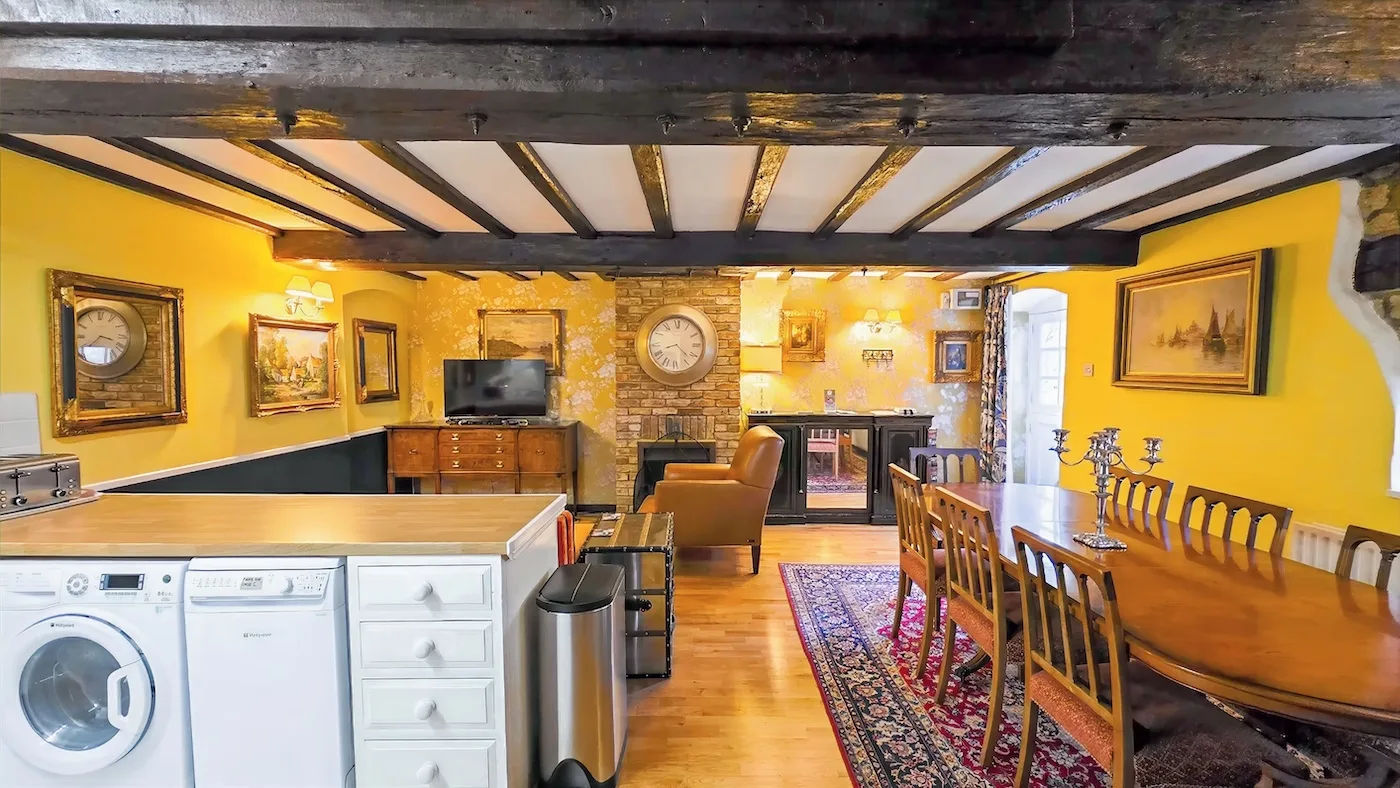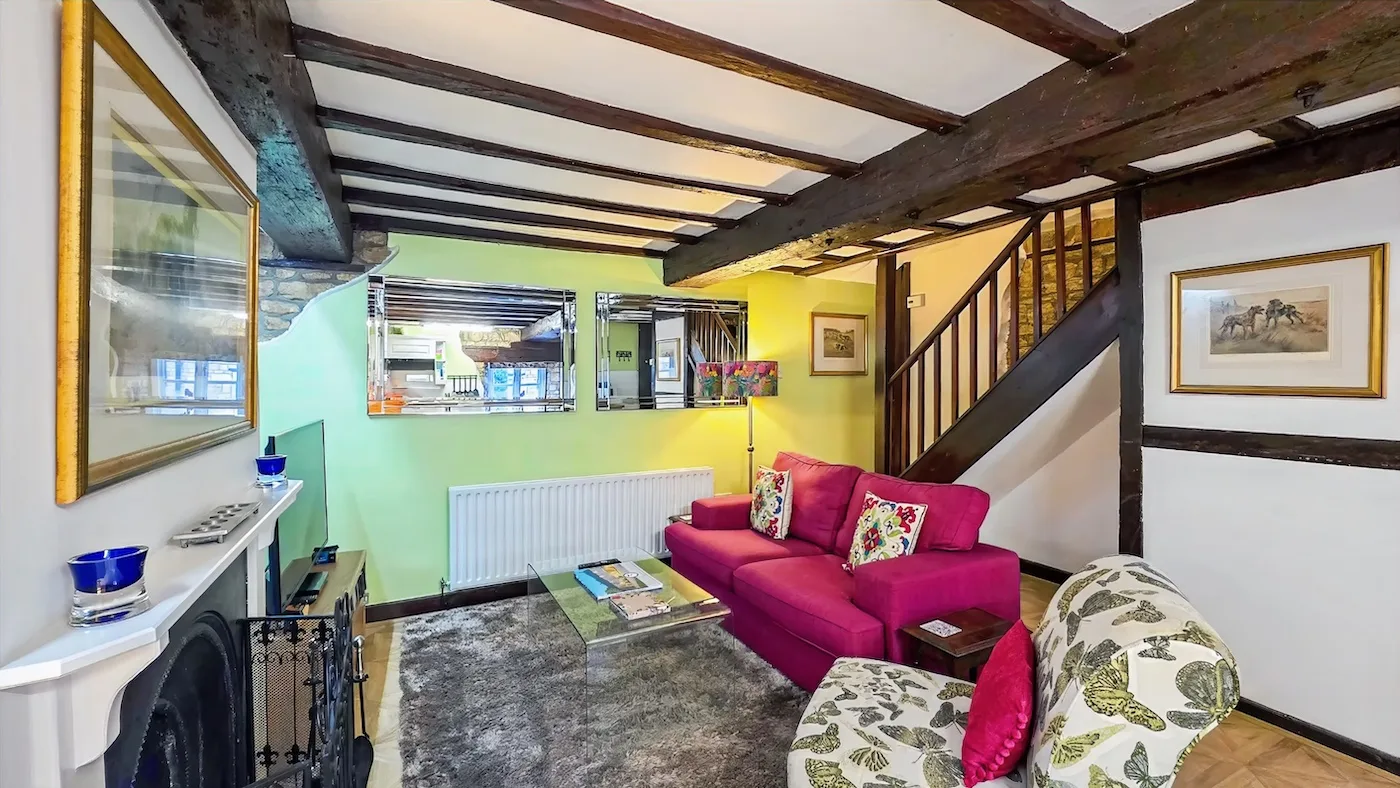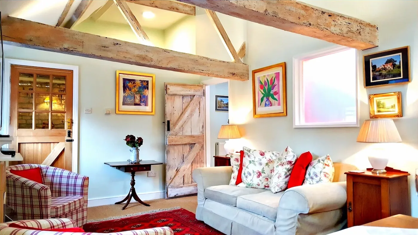 Also part of the converted listed barn, this charming property has a cosy, welcoming feel. Decorated in warm greens and pinks, it combines 19th-century character with modern comforts. You’ll find lovely exposed oak beams, a fully equipped kitchen, and a contemporary bathroom.