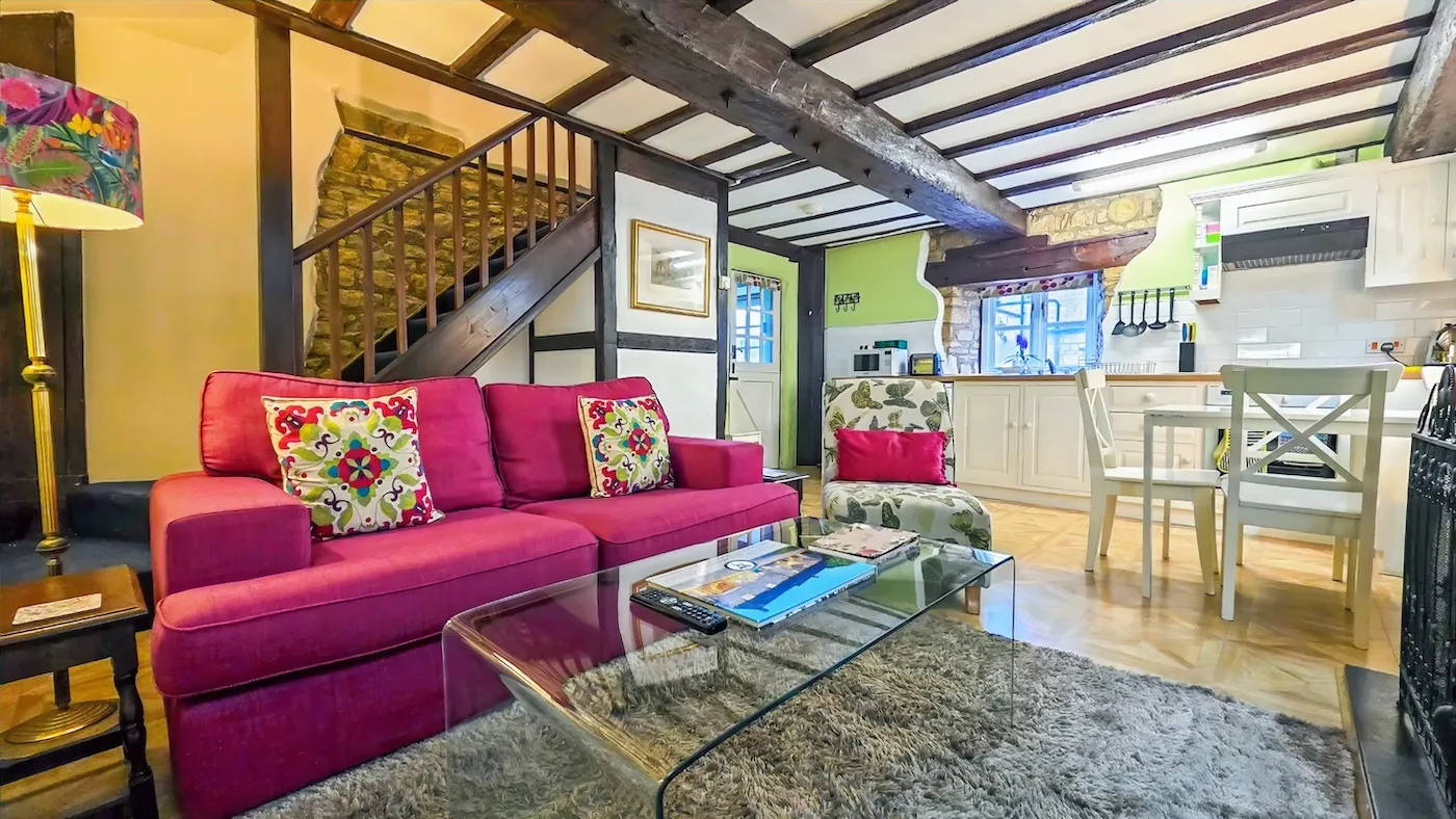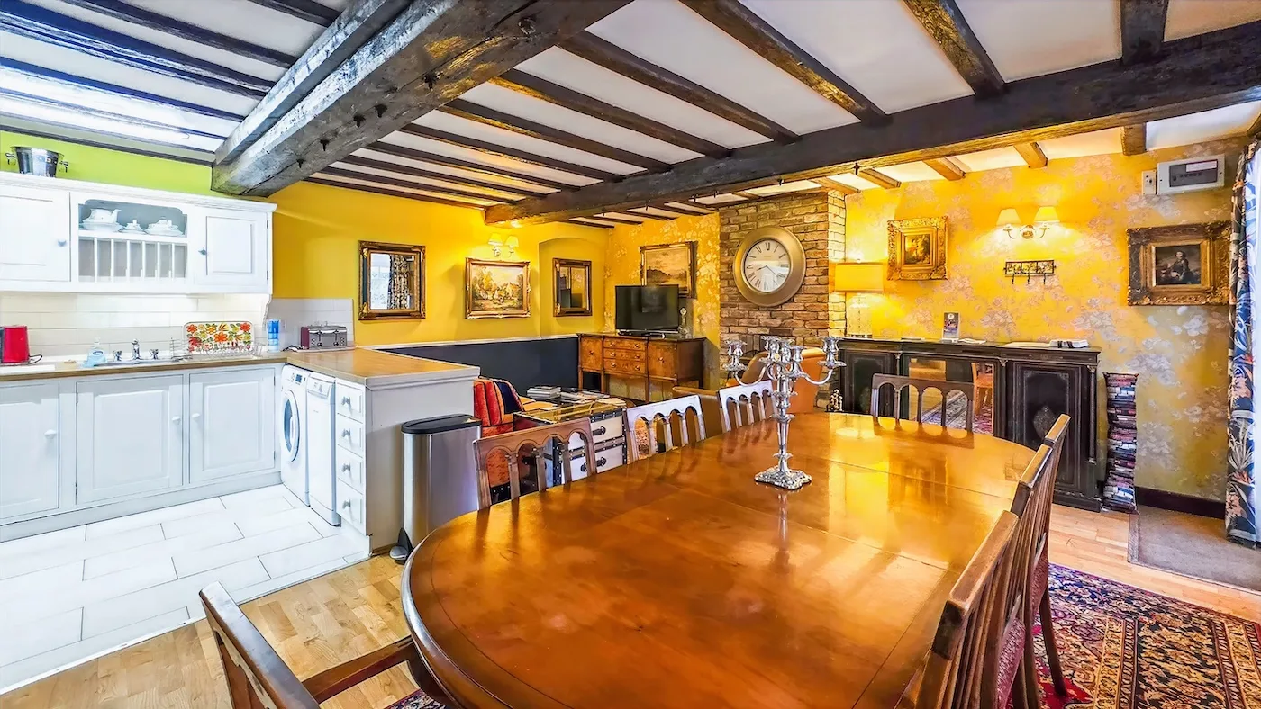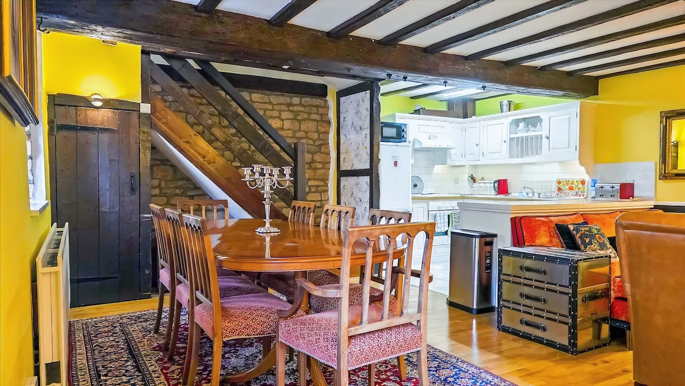 Also part of the converted listed barn, this charming property has a cosy, welcoming feel. Decorated in warm greens and pinks, it combines 19th-century character with modern comforts. You’ll find lovely exposed oak beams, a fully equipped kitchen, and a contemporary bathroom.