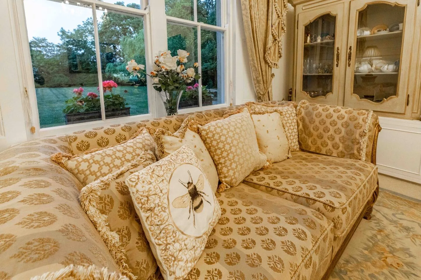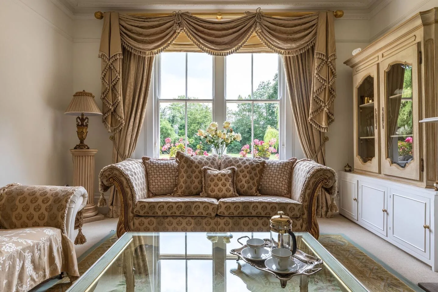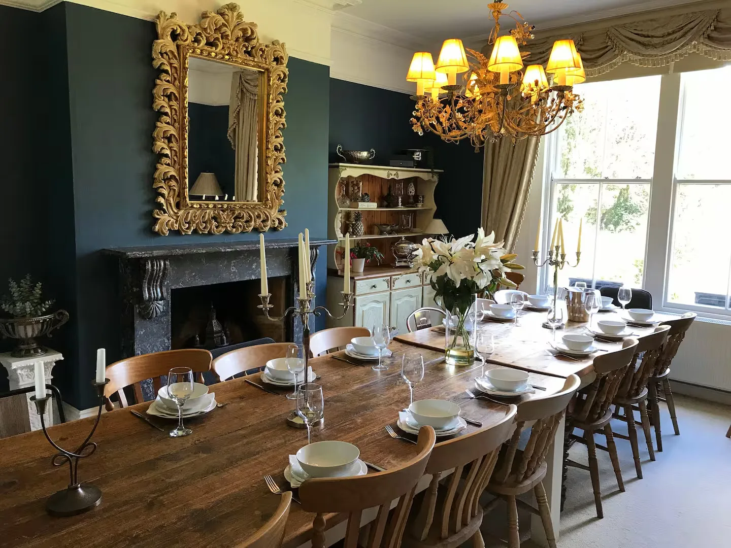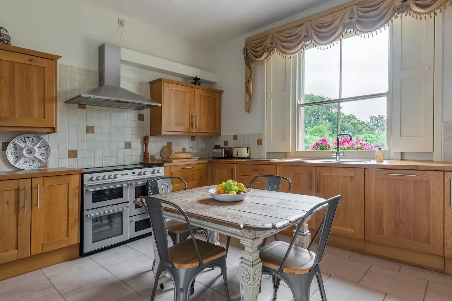 The lounge has large Georgian windows with lovely garden views and an open fire for cosy evenings. The grand dining room is perfect for celebratory dinners. The breakfast kitchen has everything you need – electric range cooker, filter coffee maker, cafetières, kettle, toaster, microwave, two fridge/freezers, and a dishwasher – plus a washing machine and dryer in the utility room.